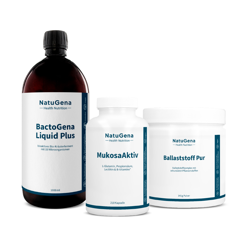Unser exklusives Vorteilsset Darm-Komplex vereint drei Produkte, die sich sinnvoll ergänzen und aufeinander abgestimmt sind – mit Ballaststoffen, Vitaminen, Mineralstoffen und Pflanzenstoffen: BactoGena Liquid Plus, MukosaAktiv und BallaststoffPur.