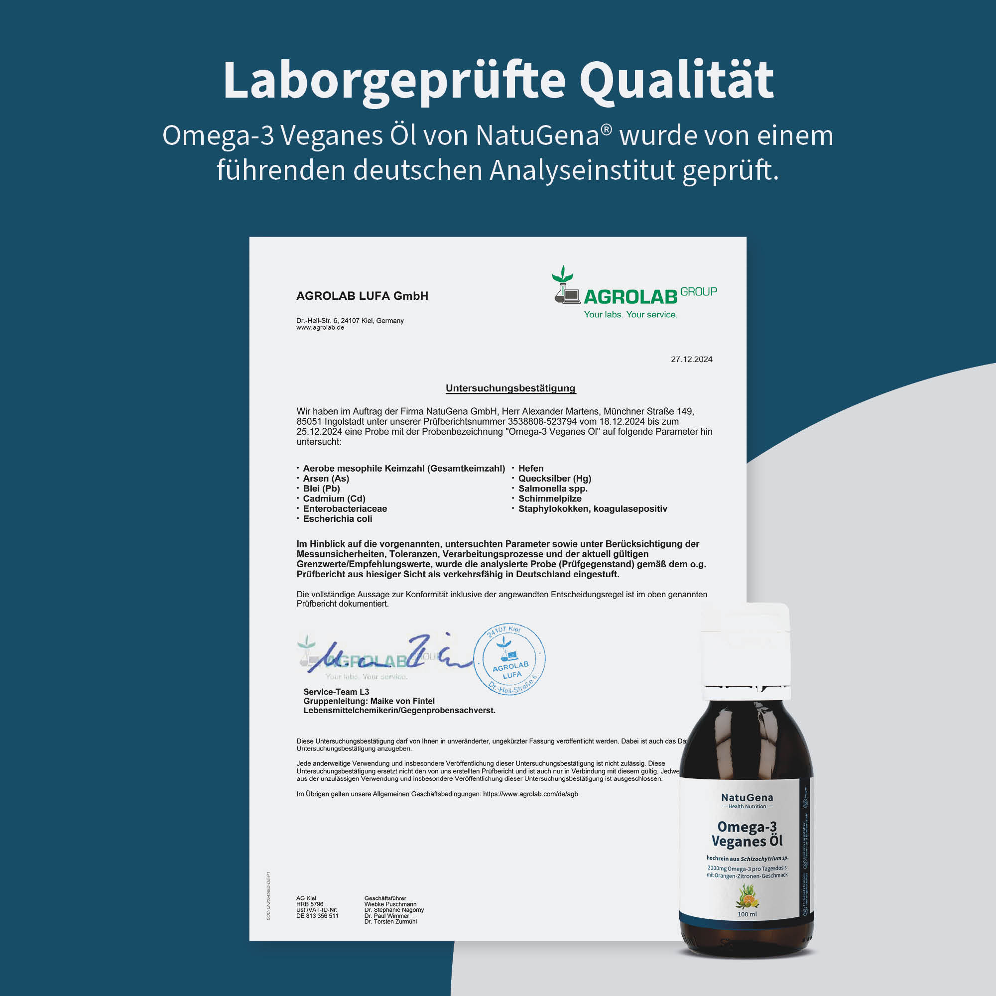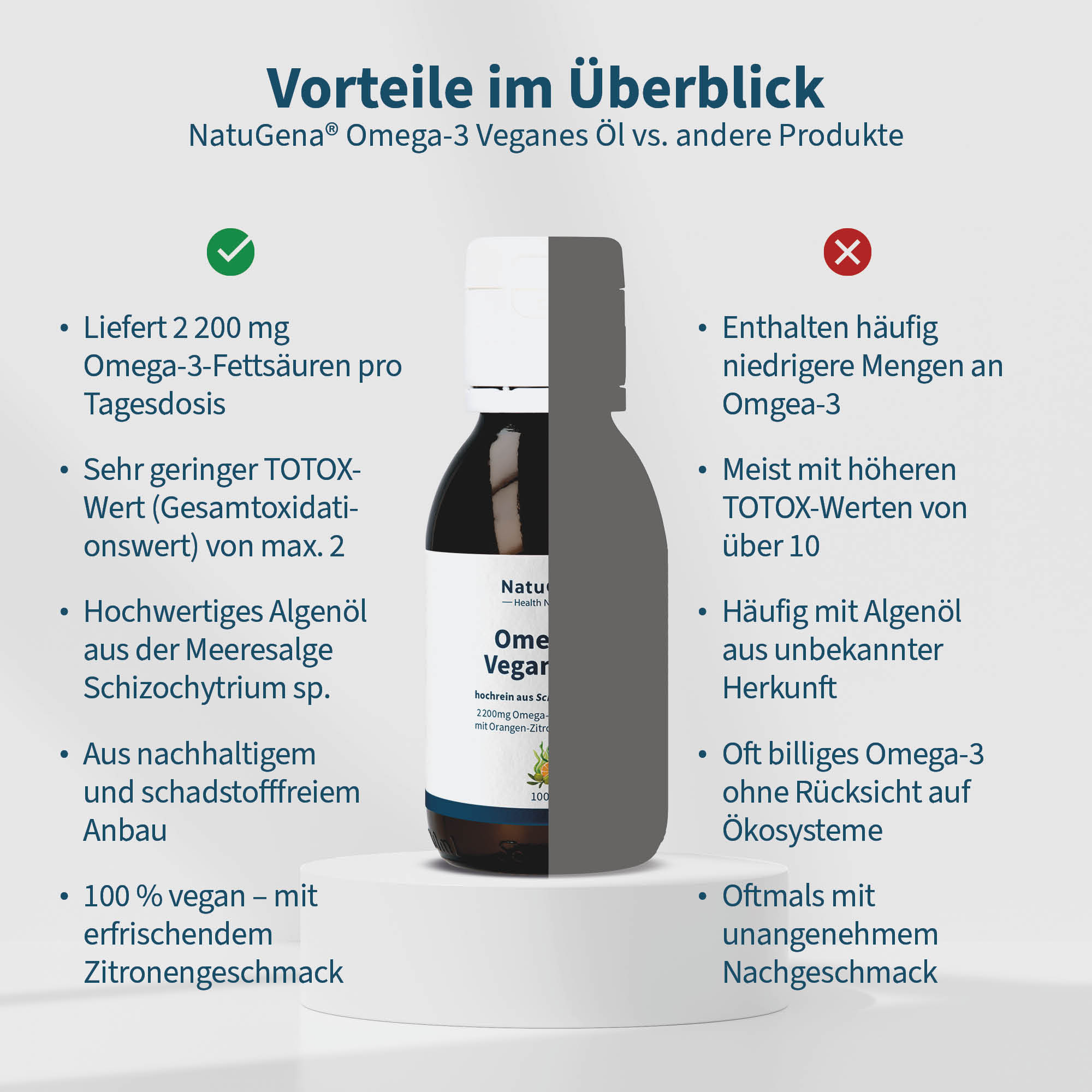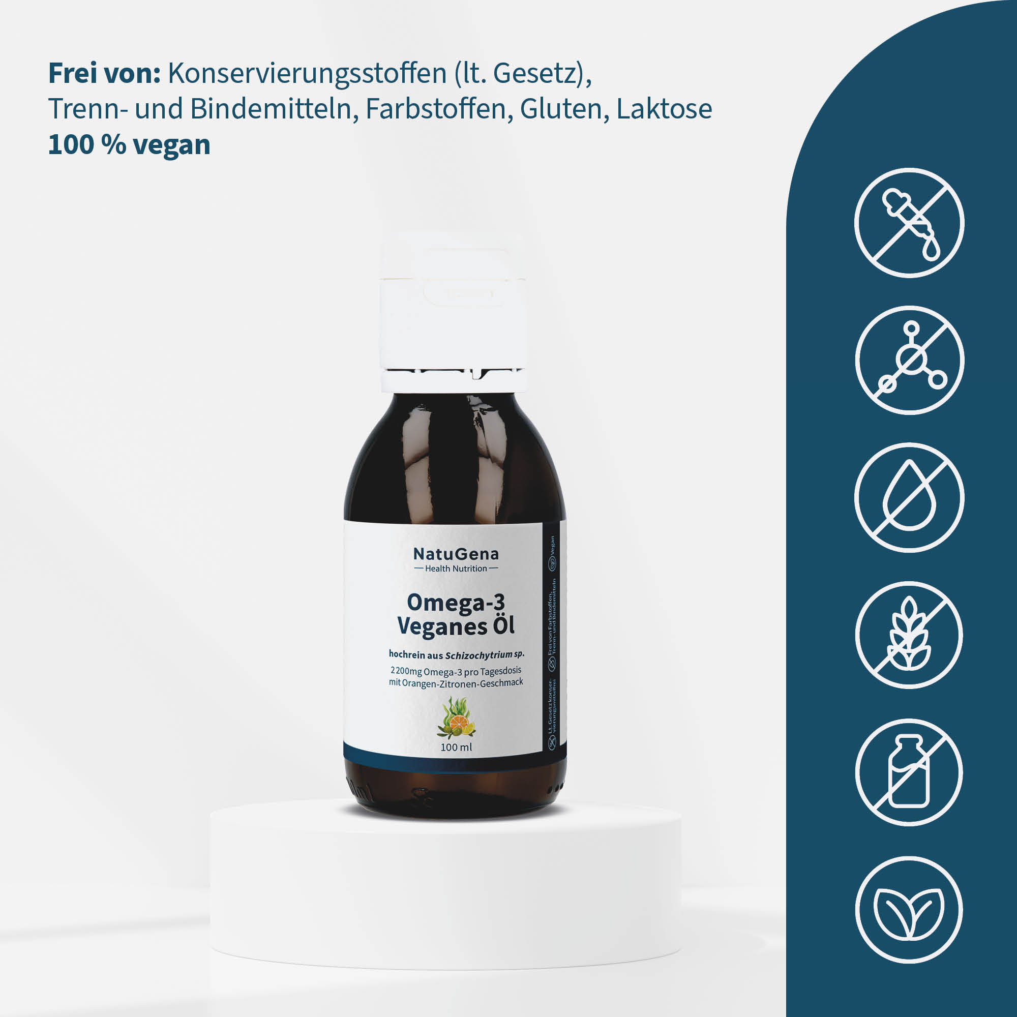 NatuGena Omega-3 Veganes Öl – Pflanzliches Omega-3-Öl mit frischen Orangen-Zitronengeschmack. Das hochwertige Algenöl wird aus der Mikroalge Schizochytrium sp. gewonnen – rein pflanzlich und unter nachhaltigen Bedingungen. Unser Omega-3 Veganes Öl bietet einen bemerkenswert hohen Gehalt an DHA und EPA. 100 ml in praktischer Braunglasflasche für eine Versorgung von 20 Tagen.