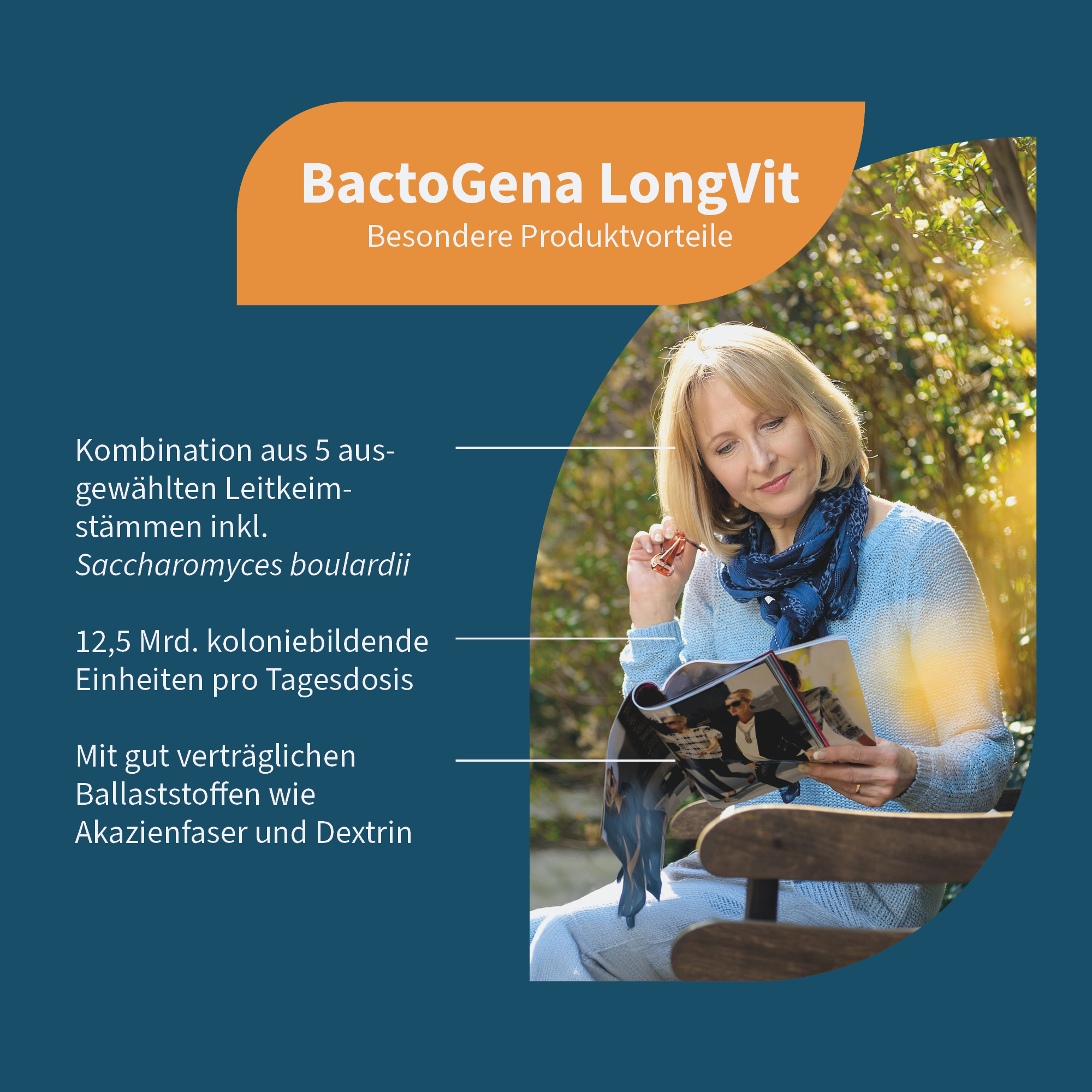 Der Darm ist ein komplexes Ökosystem, in dem zahlreiche Mikroorganismen in einem fein abgestimmten Gleichgewicht zusammenarbeiten. Dieses Gleichgewicht verändert sich im Laufe des Lebens und wird von vielen Faktoren beeinflusst, darunter Ernährung, Lebensstil und äußere Einflüsse. BactoGena LongVit wurde entwickelt, um diese komplexe Struktur zu ergänzen. Die Kombination aus ausgewählten Bakterienstämmen, Spezialhefe und Ballaststoffen ist auf eine moderne Rezeptur abgestimmt.