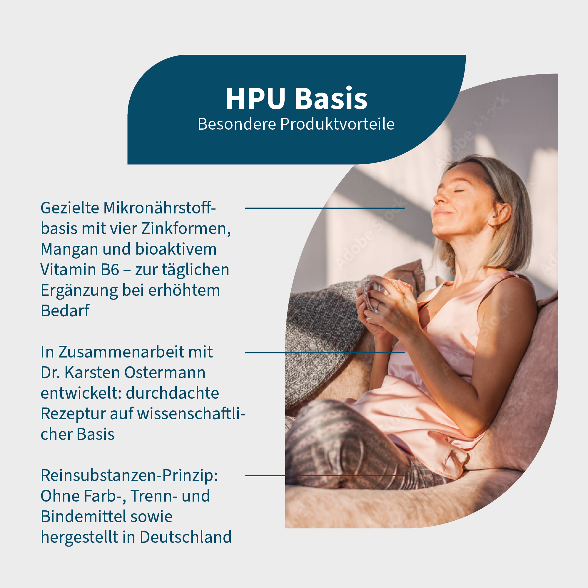 HPU Basis wurde speziell für Menschen entwickelt, die besonderen Wert auf eine gezielte Mikronährstoffversorgung legen, etwa aufgrund individueller Stoffwechseldynamiken oder eines funktionell erhöhten Bedarfs. Die Rezeptur baut auf wissenschaftlichen Erkenntnissen rund um den Mikronährstoffhaushalt bei spezieller Belastung auf. Bei bestimmten physiologischen Situationen kann es sinnvoll sein, ausgewählte Mikronährstoffe in bioverfügbarer Form gezielt zu ergänzen. HPU Basis dient als zusätzliche Basisversorgung bei erhöhtem Mikronährstoffbedarf zu unserem Produkt „HPU“.