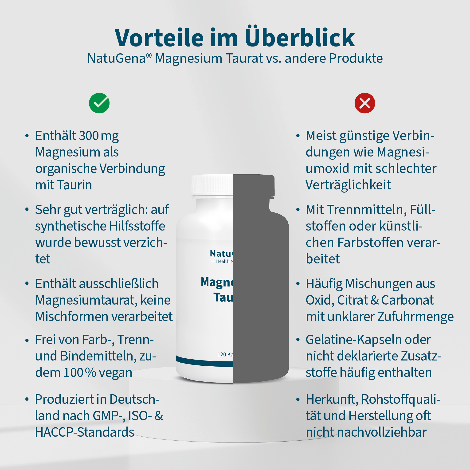 Die Reinheit und Qualität unserer Produkte stehen für uns bei NatuGena an oberster Stelle. Unser Ziel ist es Nahrungsergänzungsmittel in kompromissloser Qualität zu entwickeln und dabei das Beste aus Wissenschaft und Natur zu vereinen. Vom Rohstoff bis zur fertigen Verpackung durchlaufen alle Prozesse strenge Kontrollen und sind darauf ausgelegt, unseren Reinheitsansprüchen gerecht zu werden.