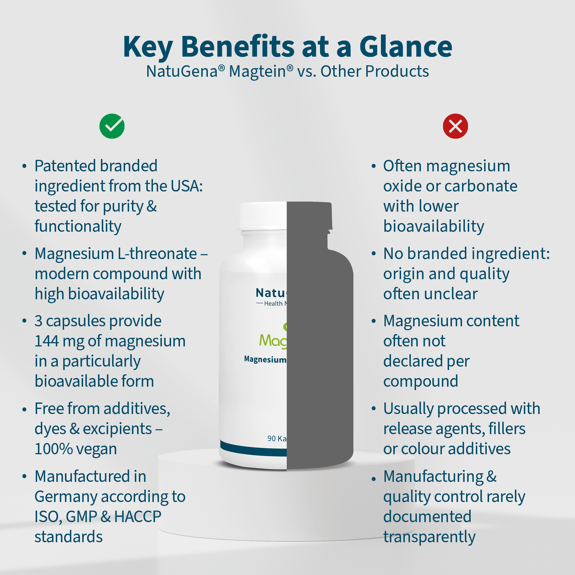 Magtein® von NatuGena – Patentierter Markenrohstoff Magtein® aus geprüfter Herstellung in den USA. Enthält Magnesium, gebunden an L-Threonsäure, ein natürliches Stoffwechselprodukt von Vitamin C. Diese Form zeichnet sich durch eine besonders hohe Bioverfügbarkeit aus. Enthält 2003 mg Magnesium L-Threonat pro Tagesdosis (entspricht 144 mg elementarem Magnesium). 90 Kapseln für eine 30-Tage-Versorgung.