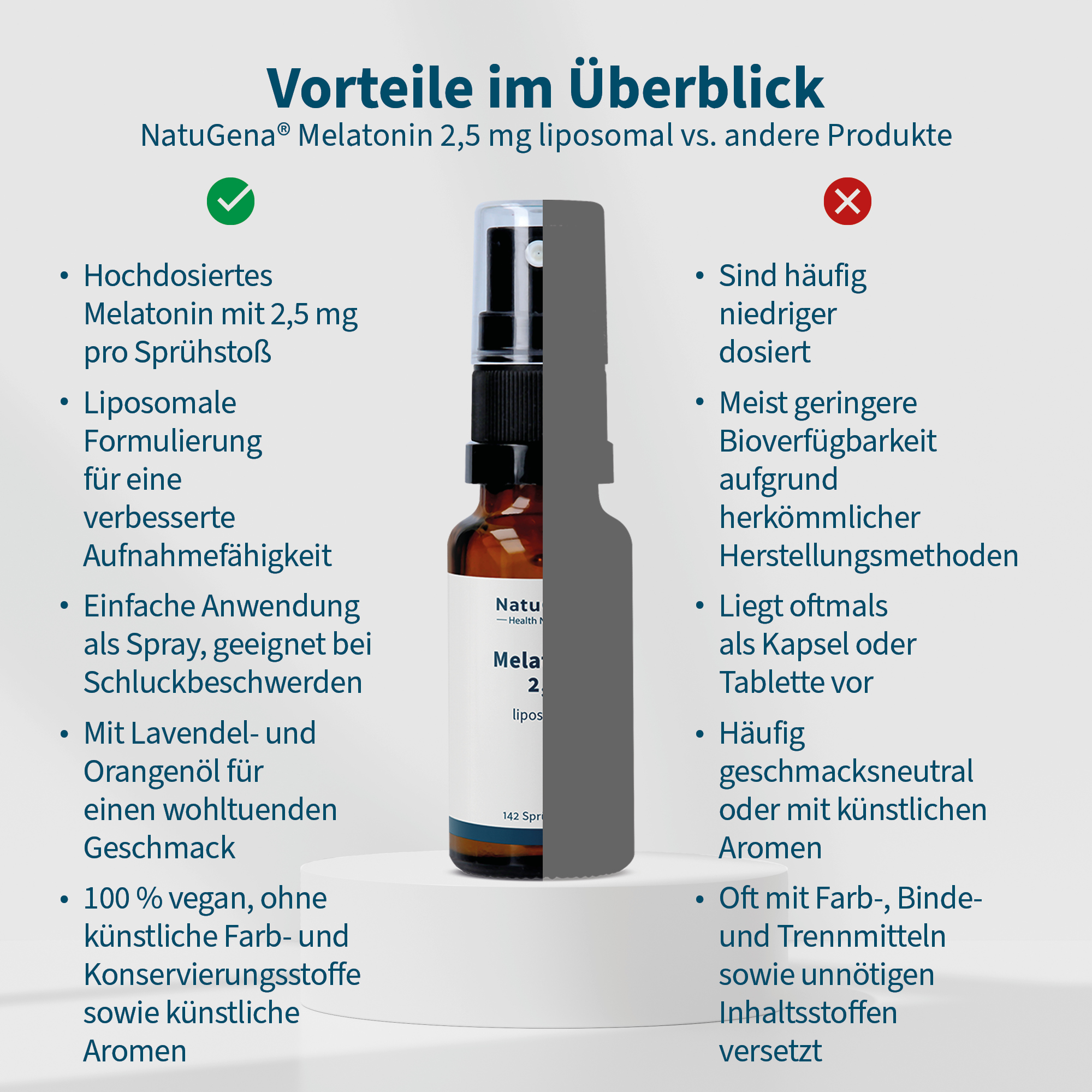 NatuGena Melatonin 2,5 – Melatonin-Spray mit 2,5 mg1 Melatonin pro Sprühstoß. Es verwendet eine innovative liposomale Technologie, die eine optimale Aufnahme gewährleistet. Mit angenehmem Orangen- und Lavendelöl als Aroma. Mit nur einem Sprühstoß bei Bedarf reicht eine Packung für 142 Tage – über 4 Monate lang.