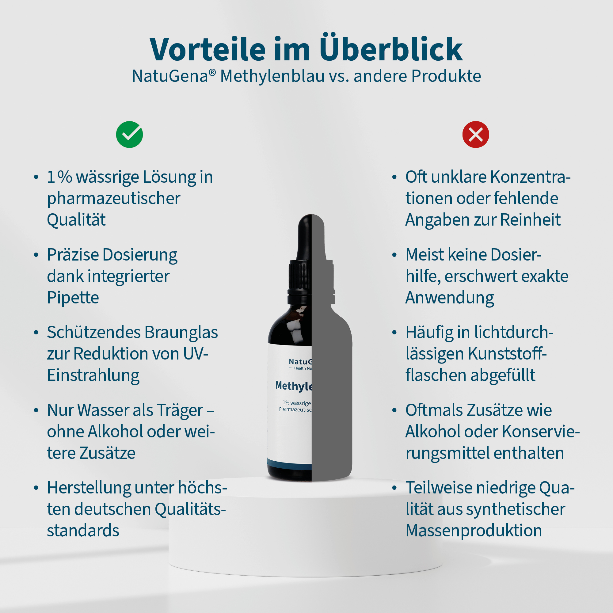 Für Interessierte empfehlen wir ergänzende Literatur, beispielsweise das Buch „Methylenblau“ von Mark Sloan, das bei uns separat erhältlich ist. Es bietet vertiefende Informationen über mögliche Anwendungsbereiche.