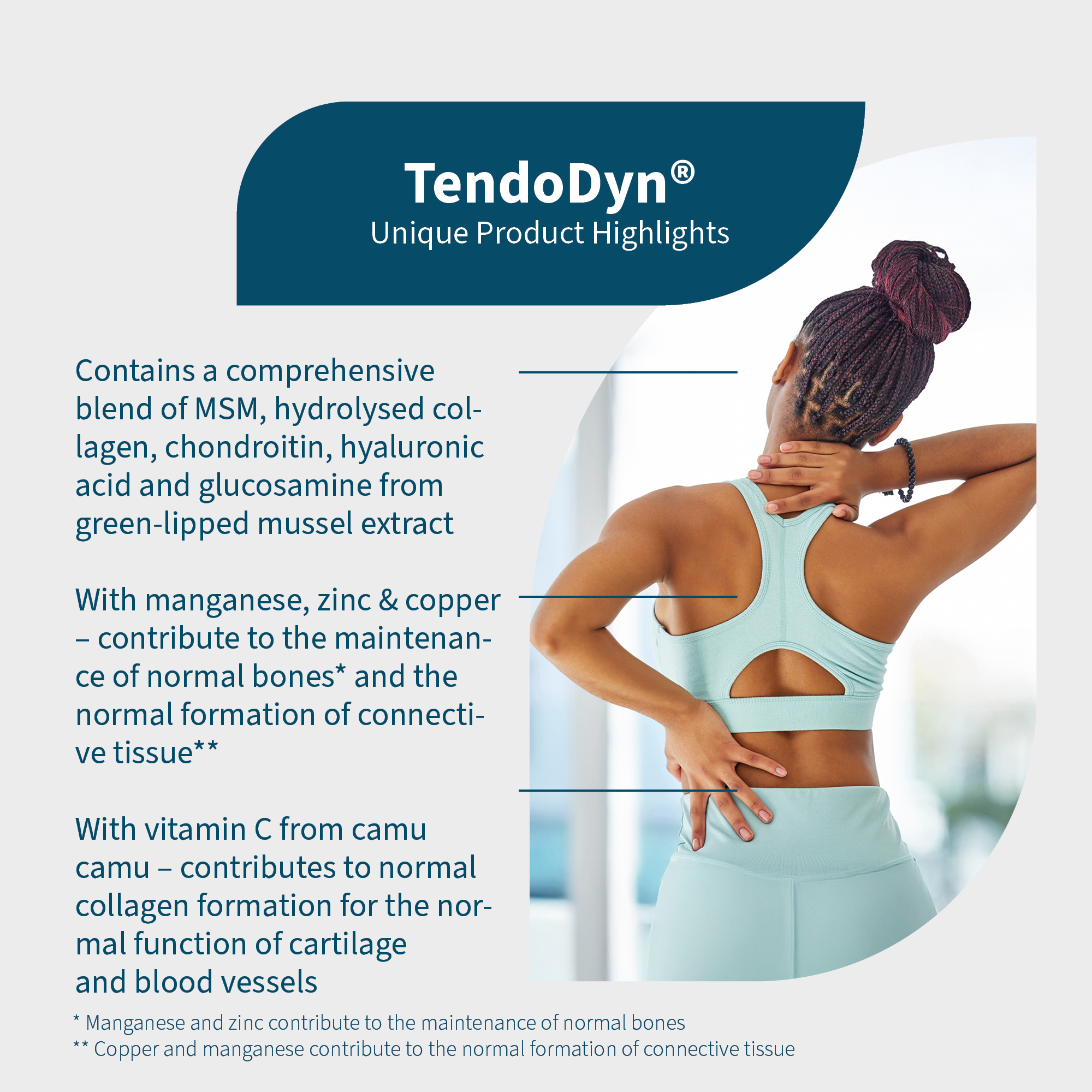 TendoDyn combines MSM, hydrolysed collagen, chondroitin sulphate, hyaluronic acid and glucosamine from green-lipped mussel extract, enriched with high-dose vitamins and minerals. Vitamin C from camu camu contributes to normal collagen formation for the normal function of cartilage. Copper supports normal connective tissue formation, while manganese, copper and vitamin K help maintain normal bones and teeth. Zinc contributes to the maintenance of normal skin, hair, nails and bones.