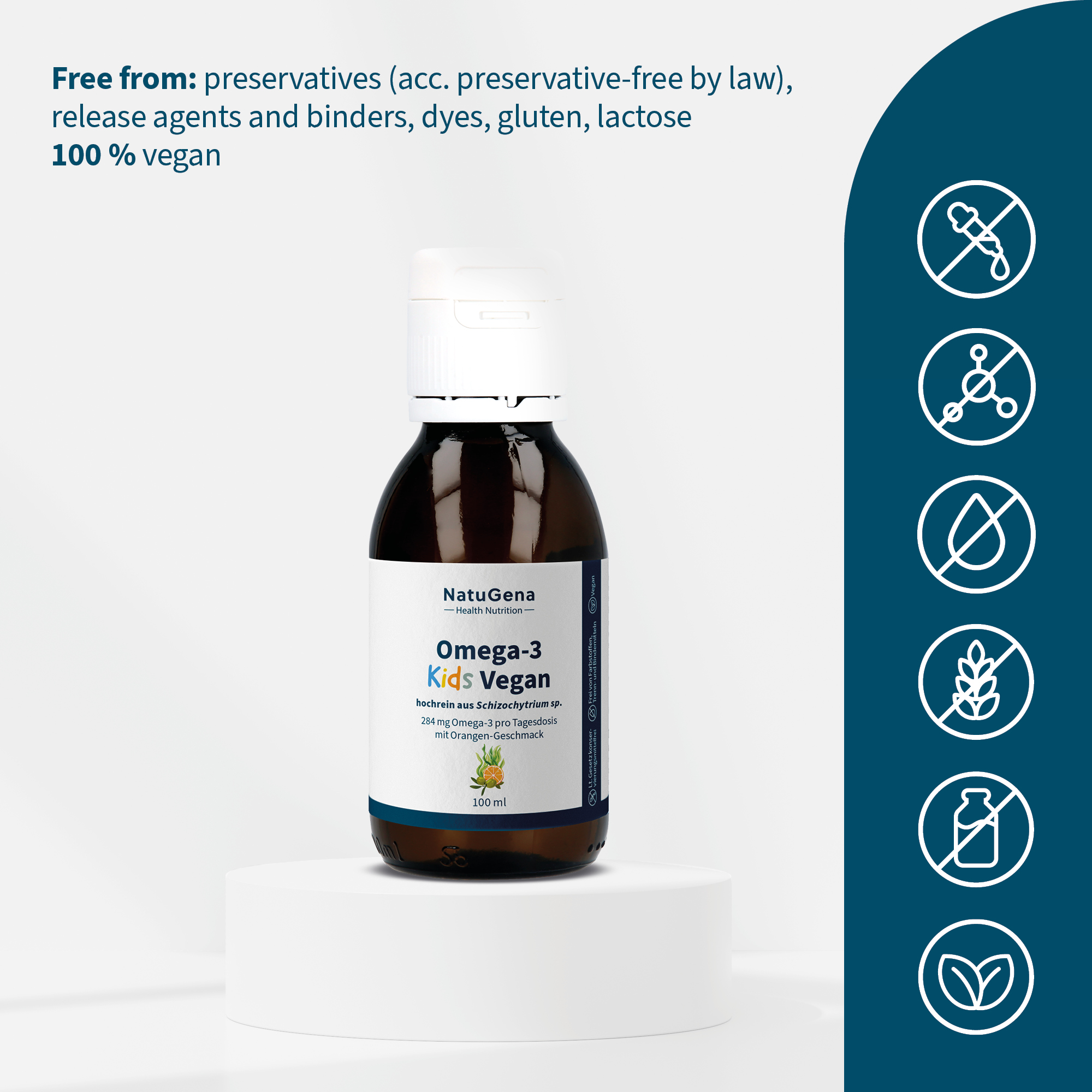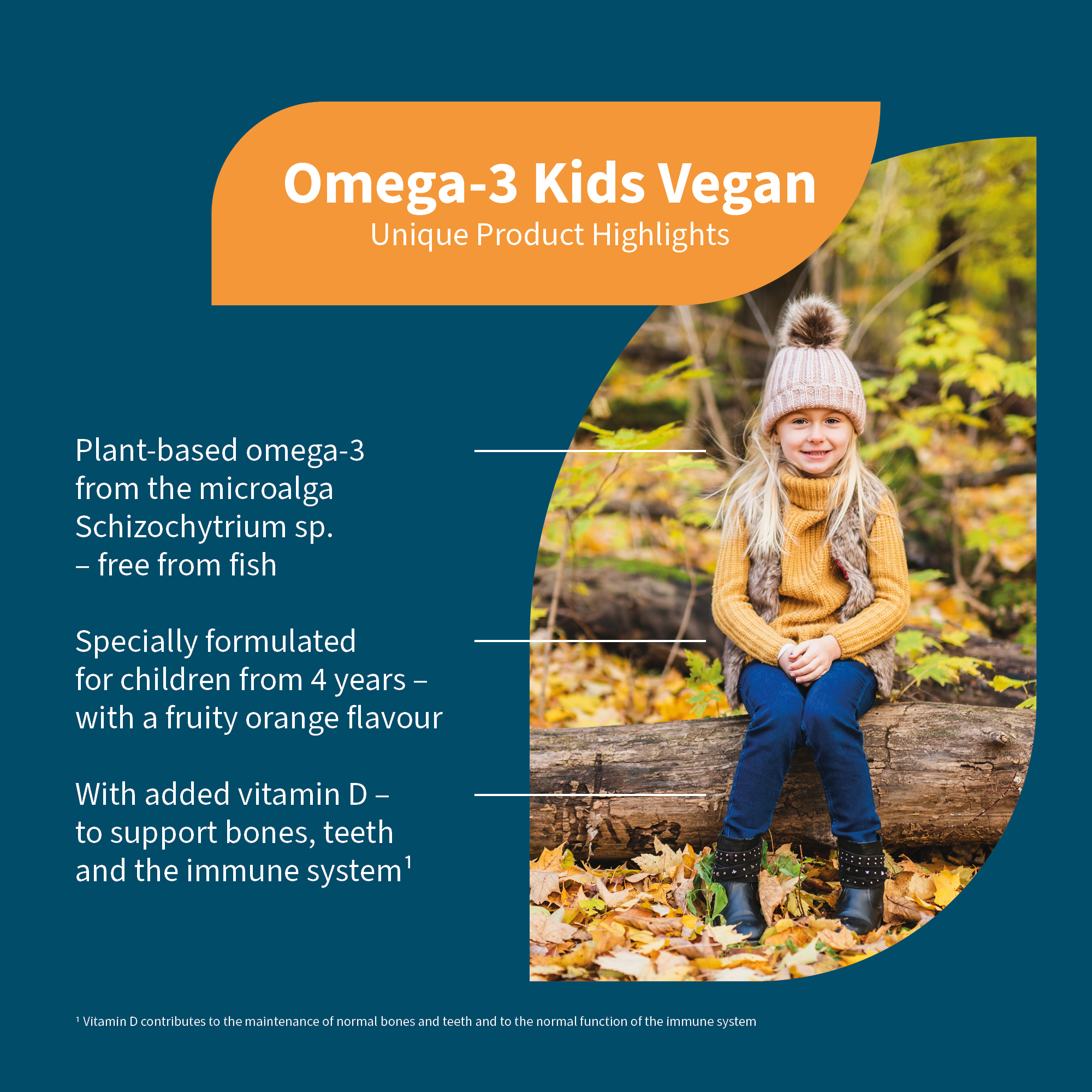 This formula is tailored to children's needs, providing valuable omega-3 fatty acids from a plant-based, contaminant-free source, with a pleasant mild orange flavour.