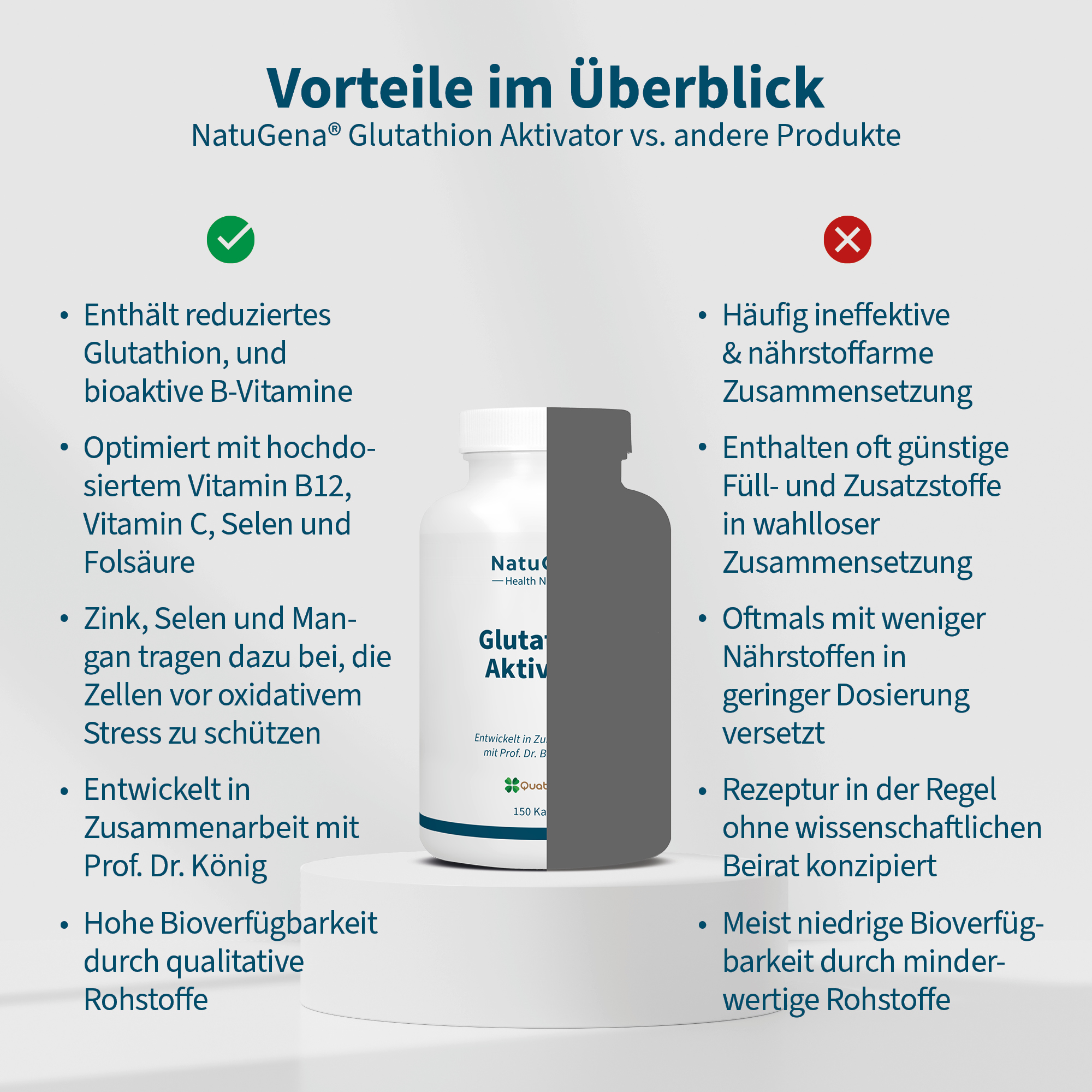 NatuGena Glutathion Activator – Combines high-dose reduced glutathione with carefully selected synergistic co-factors, including MSM (methylsulfonylmethane), R-alpha-lipoic acid, and bioactive forms of B1, B2, B6, B9, and B12. Complemented by vitamin C, vitamin E, and essential minerals such as magnesium, manganese, selenium, and zinc. 150 vegan Capsules for a 30-days-supply.