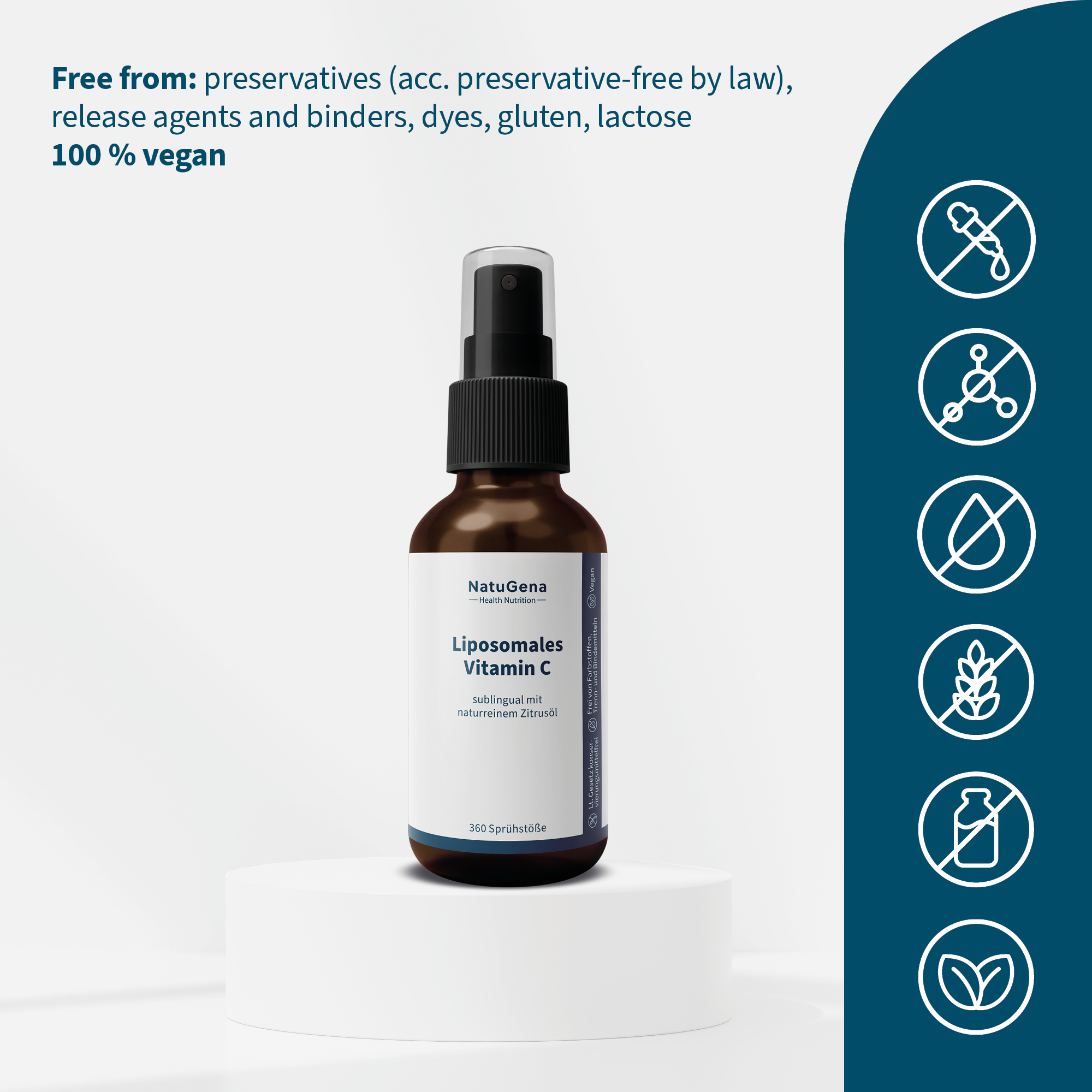 NatuGena Liposomal Vitamin C – Combination of an advanced liposomal delivery with the refreshing taste of essential citrus oils. This innovative formulation allows for direct absorption through the oral mucosa, bypassing the digestive tract. Each spray delivers 8 mg of vitamin C; due to approximately threefold higher bioavailability, this equates to about 24 mg of conventional vitamin C. The 50 ml bottle provides a 30-day supply.