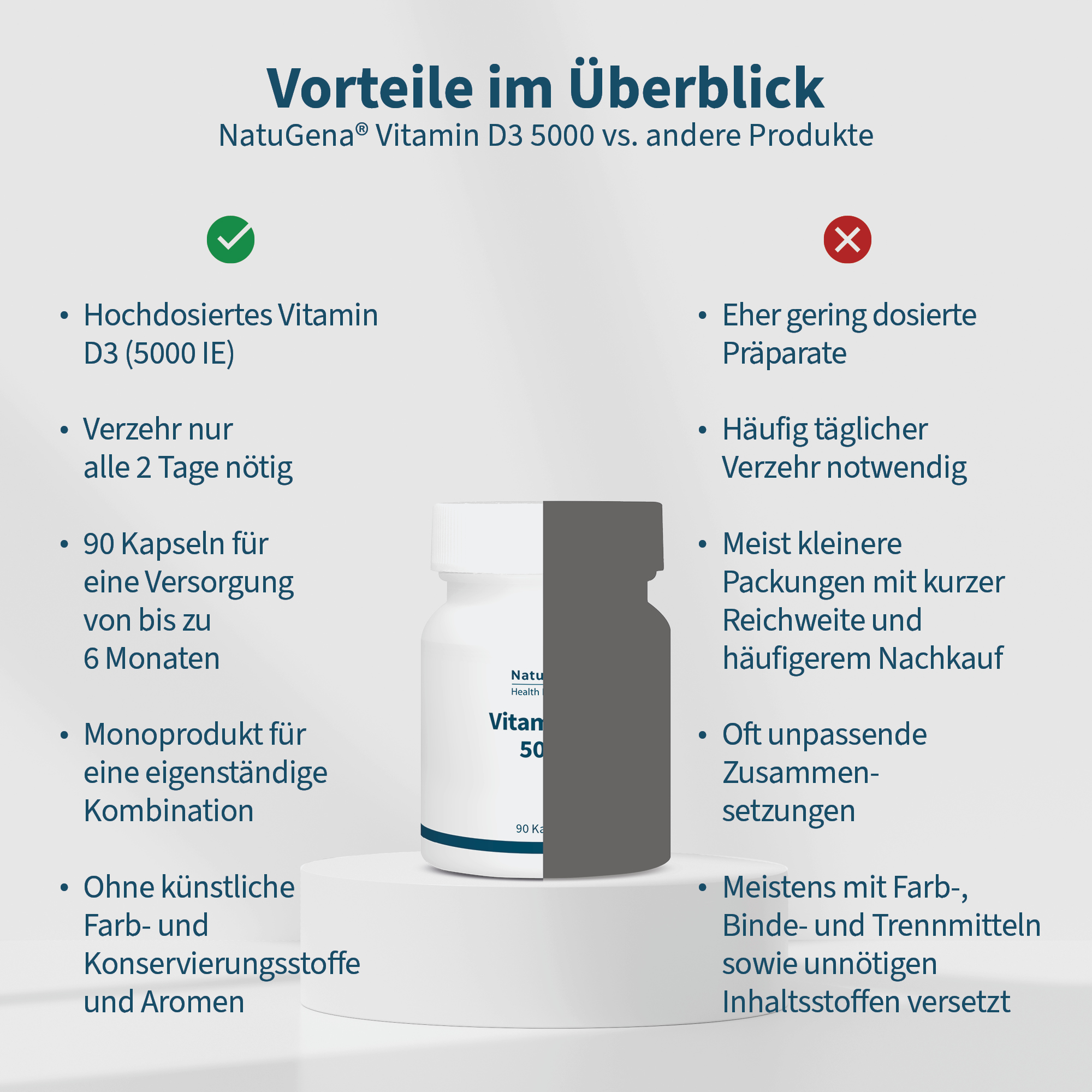NatuGena Vitamin D3 5000 was developed for individuals who value a clear, high-dose and at the same time uncomplicated application. Only one capsule every two days is sufficient to enable long-term supplementation.