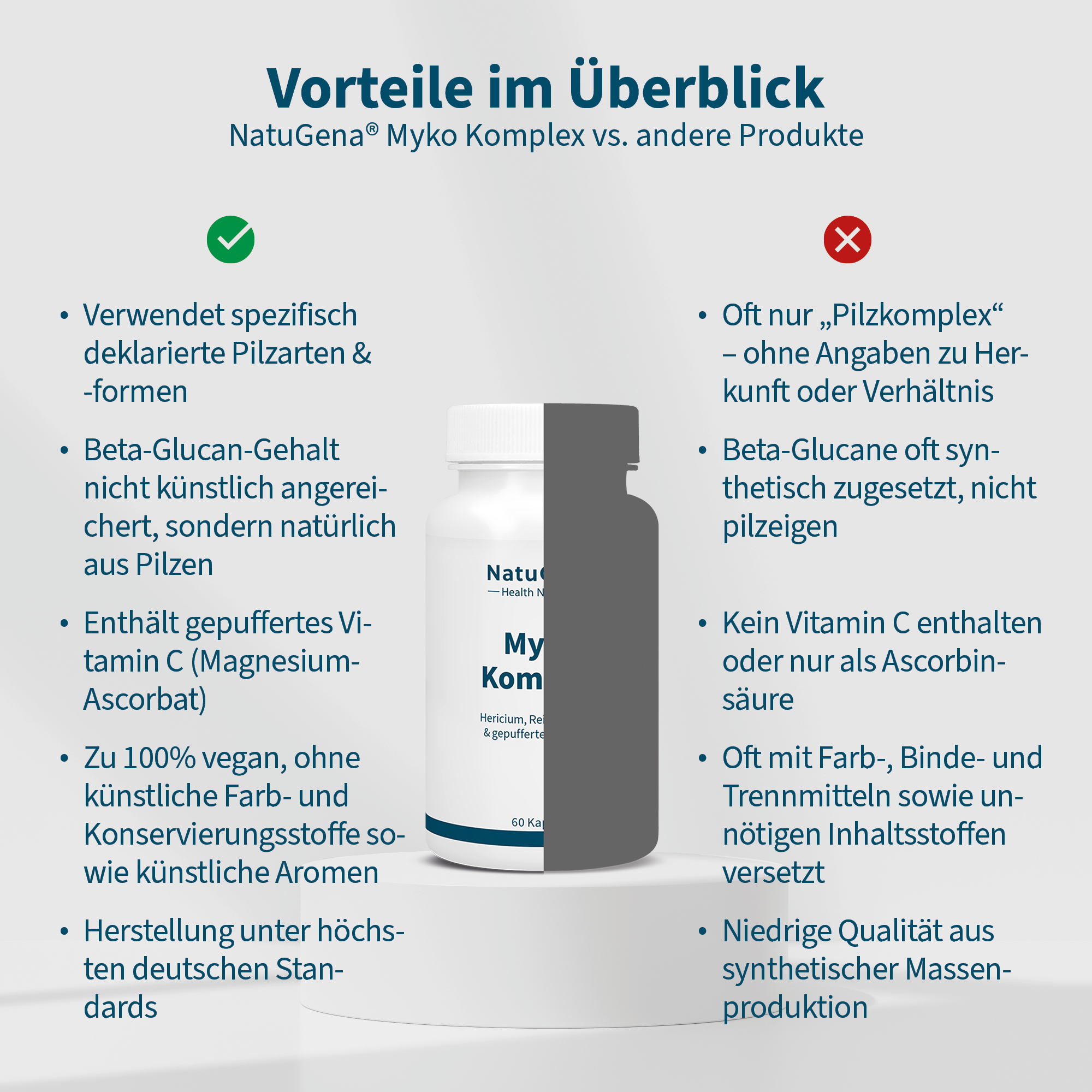 NatuGena Myko Komplex enthält gepuffertes Vitamin C aus Magnesium-Ascorbat (organisches Salz der Ascorbinsäure). Der beste Einnahmezeitpunkt für Vitalpilze mit Vitamin C ist kurz vor der Mahlzeit.