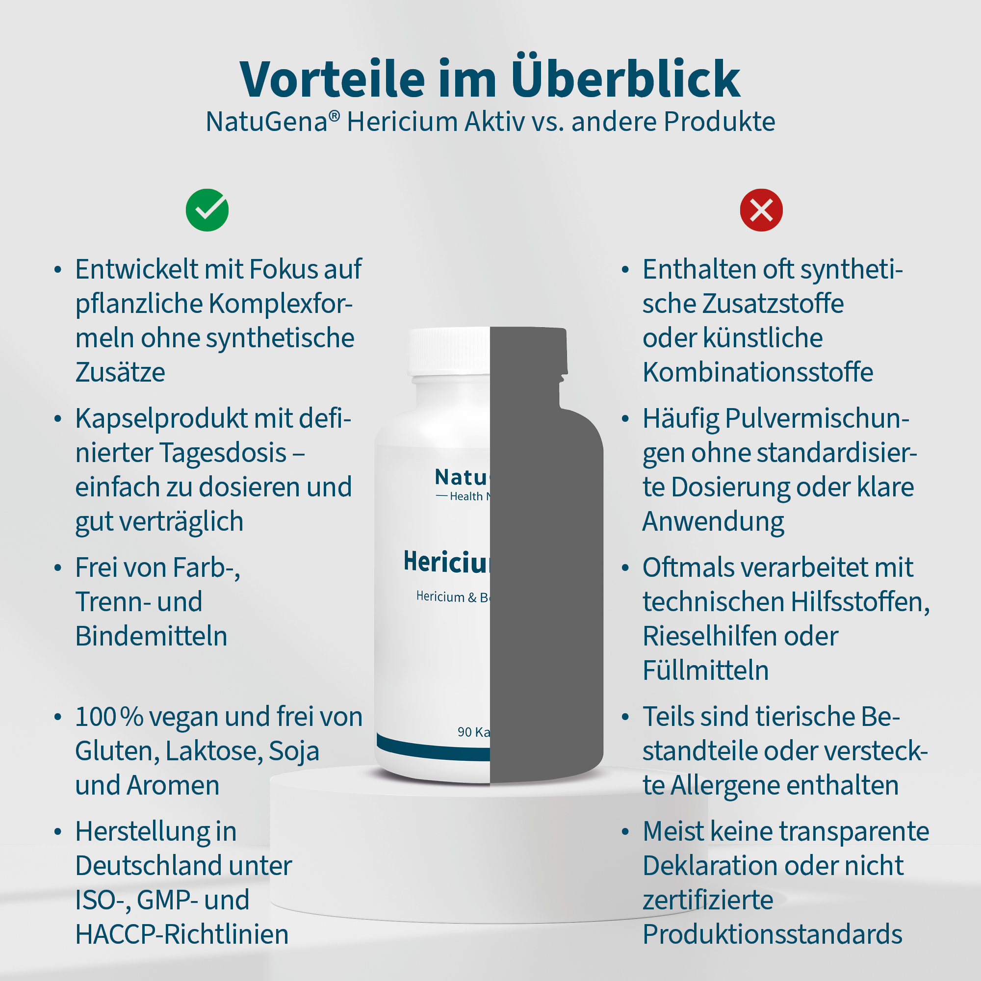 Nur Wirkstoffe (keine Hilfsstoffe, keine Farbstoffe, laut Gesetz keine Konservierungsstoffe, keine technologischen Zusätze wie Binde- und Trennmittel, keine versteckten Zusatzstoffe, frei von Gluten, Geschmacksverstärkern, Lactose, Aromen, Soja).