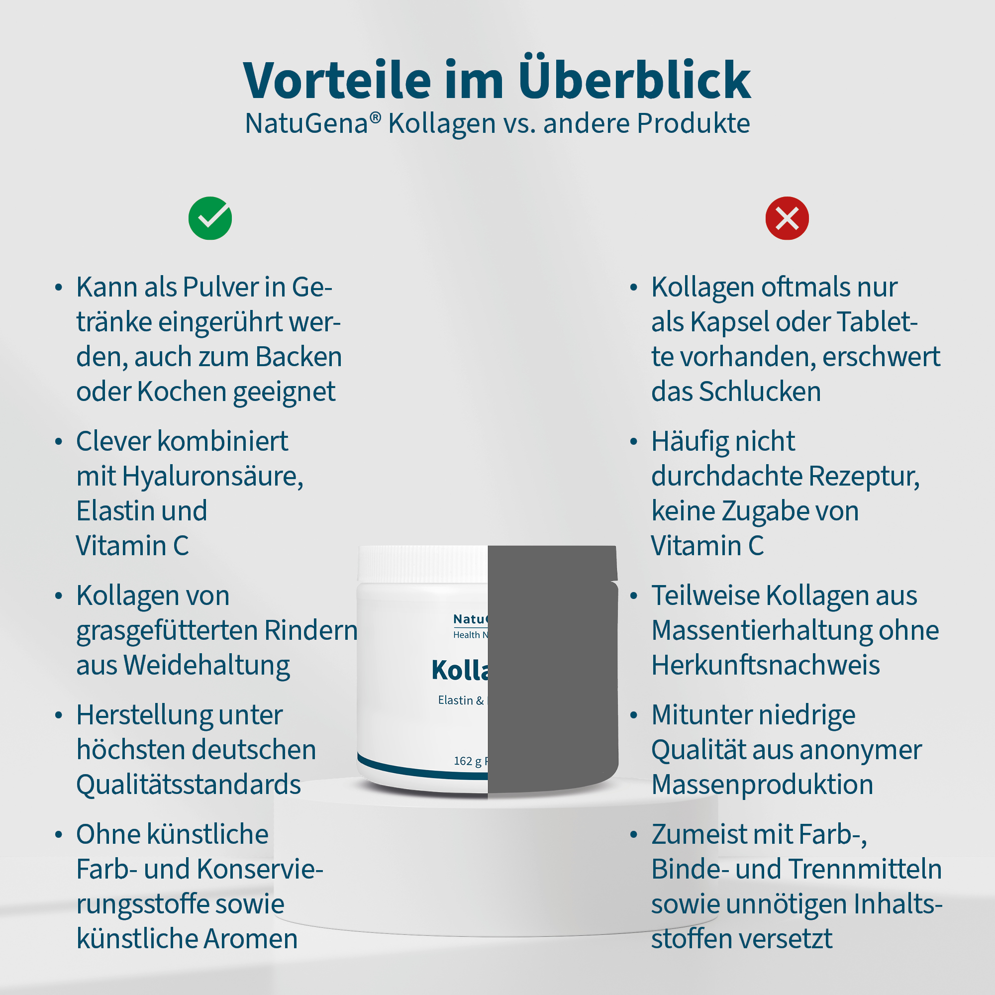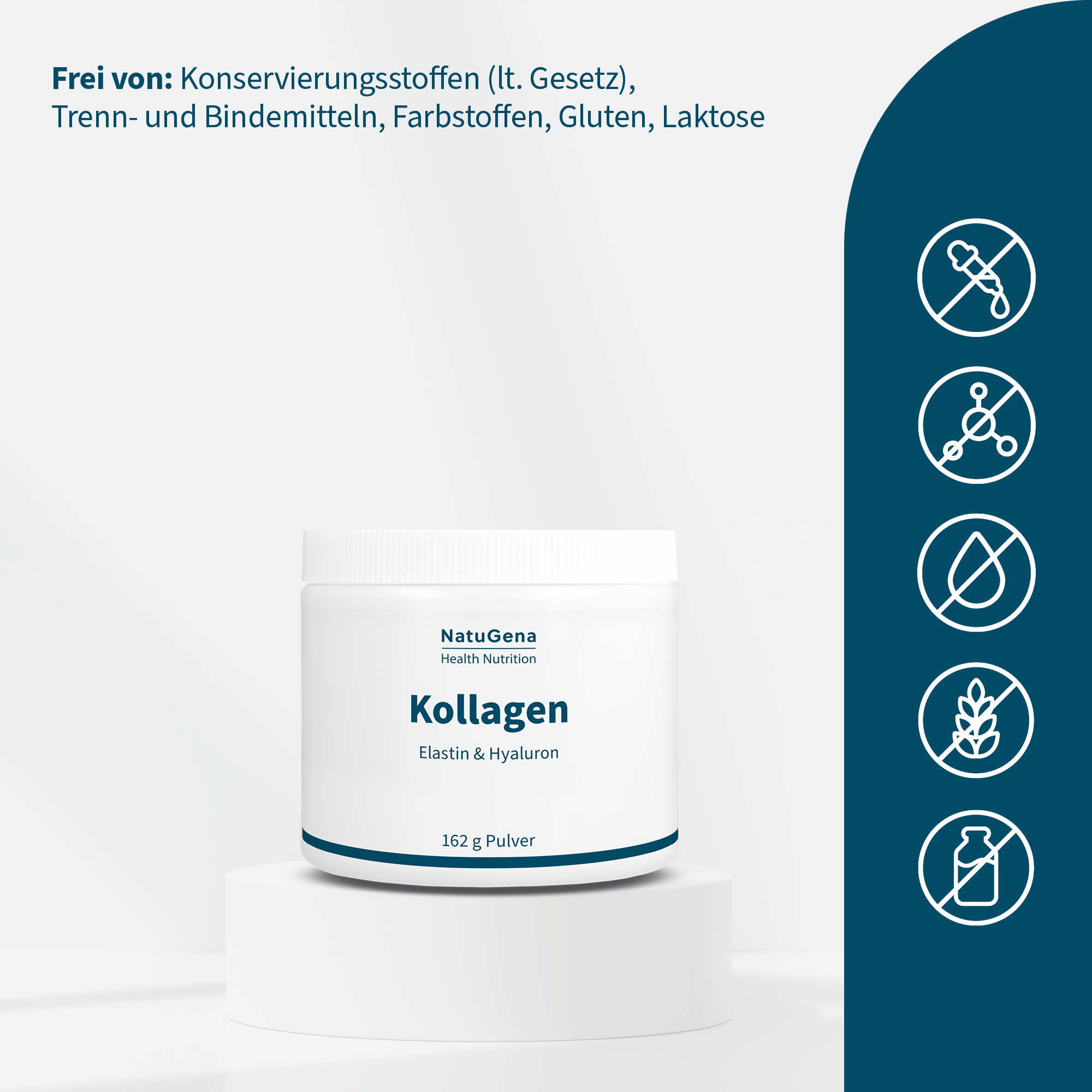 NatuGena Kollagen Elastin Hyaluron – Kollagen, Hyaluronsäure, Elastin und Vitamin C in einer fein abgestimmten Kombination. Das Pulver ist geschmacksneutral, vollständig löslich und leicht in den Alltag integrierbar. 30-Tage-Packung mit 162 g Pulver.