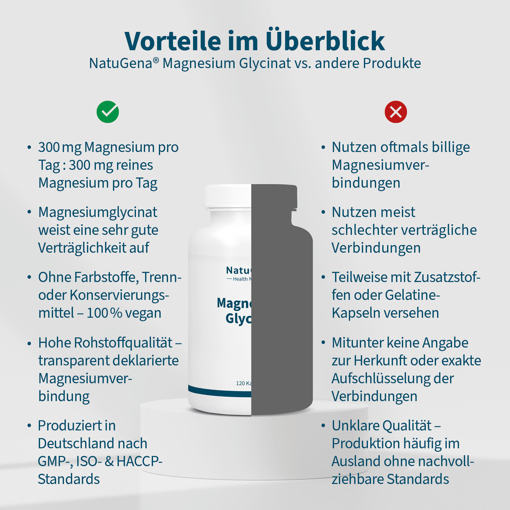 NatuGena Magnesium-Glycinat – Magnesium als organisches Magnesiumbisglycinat, gebunden an die Aminosäure Glycin. Magnesium trägt zur Verringerung von Müdigkeit und Erschöpfung, einer normalen Proteinsynthese und zur normalen Funktion des Nervensystems und psychologischen Funktion bei. Frei von Zusatzstoffen, vegan und in deutscher Herstellung – speziell verpackt in magensaftresistenten Kapseln.  120 Kapseln für eine 60-Tage-Versorgung.