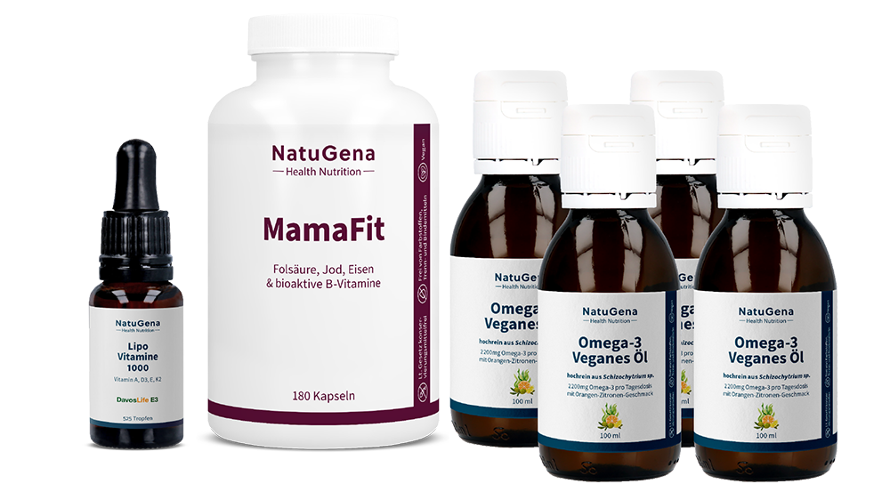 Wir empfehlen für Schwangerschaft und Stillzeit neben MamaFit zusätzlich die NatuGena LipoVitamine für einen gesunden Vitamin-D-Spiegel und Omega 3 für die Versorgung mit den Fettsäuren DHA und EPA.