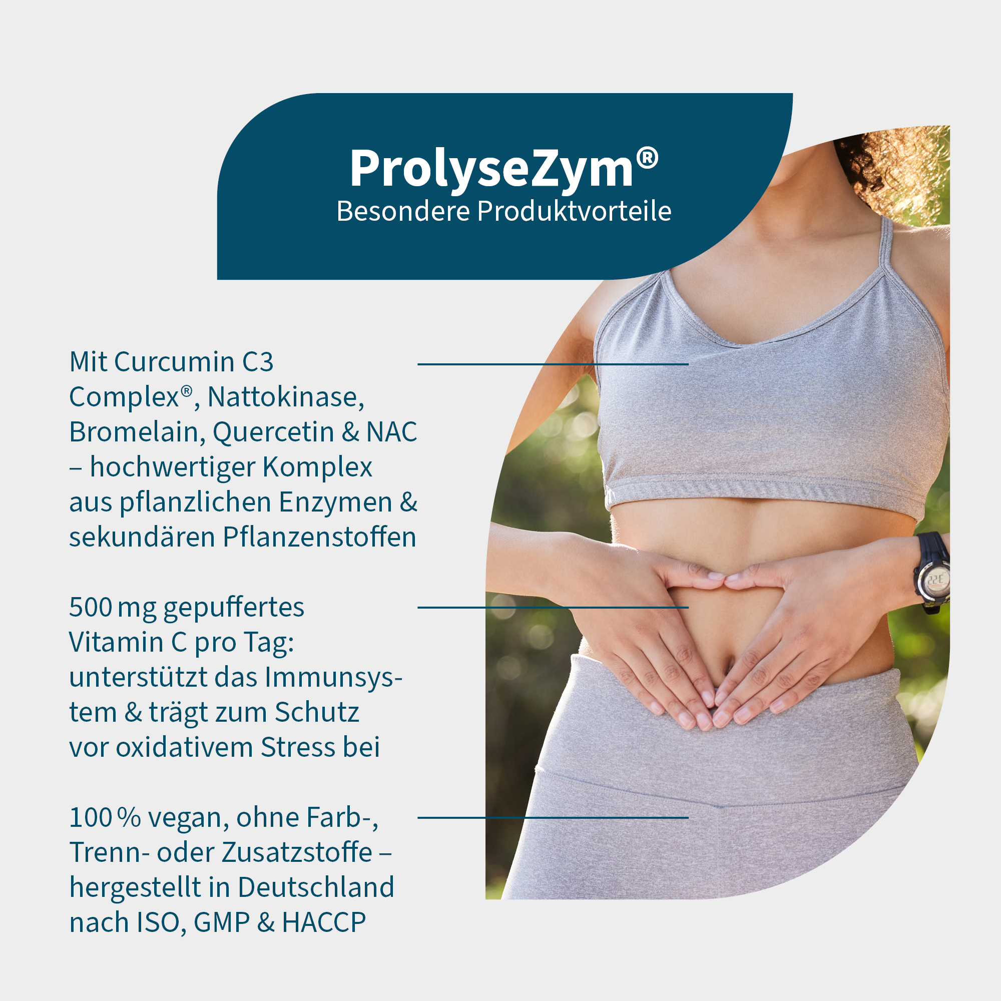 ProlyseZym kombiniert ausgewählte Enzyme, sekundäre Pflanzenstoffe und Vitamin C in einer durchdachten Rezeptur. Mit Inhaltsstoffen wie Curcumin C3 Complex®, Bromelain und liefert das Produkt natürliche Bestandteile, die aus bewährten pflanzlichen Quellen stammen. Besonders in Zeiten erhöhter Belastung oder bei einem aktiven Lebensstil kann diese Vielfalt die tägliche Ernährung gezielt ergänzen.