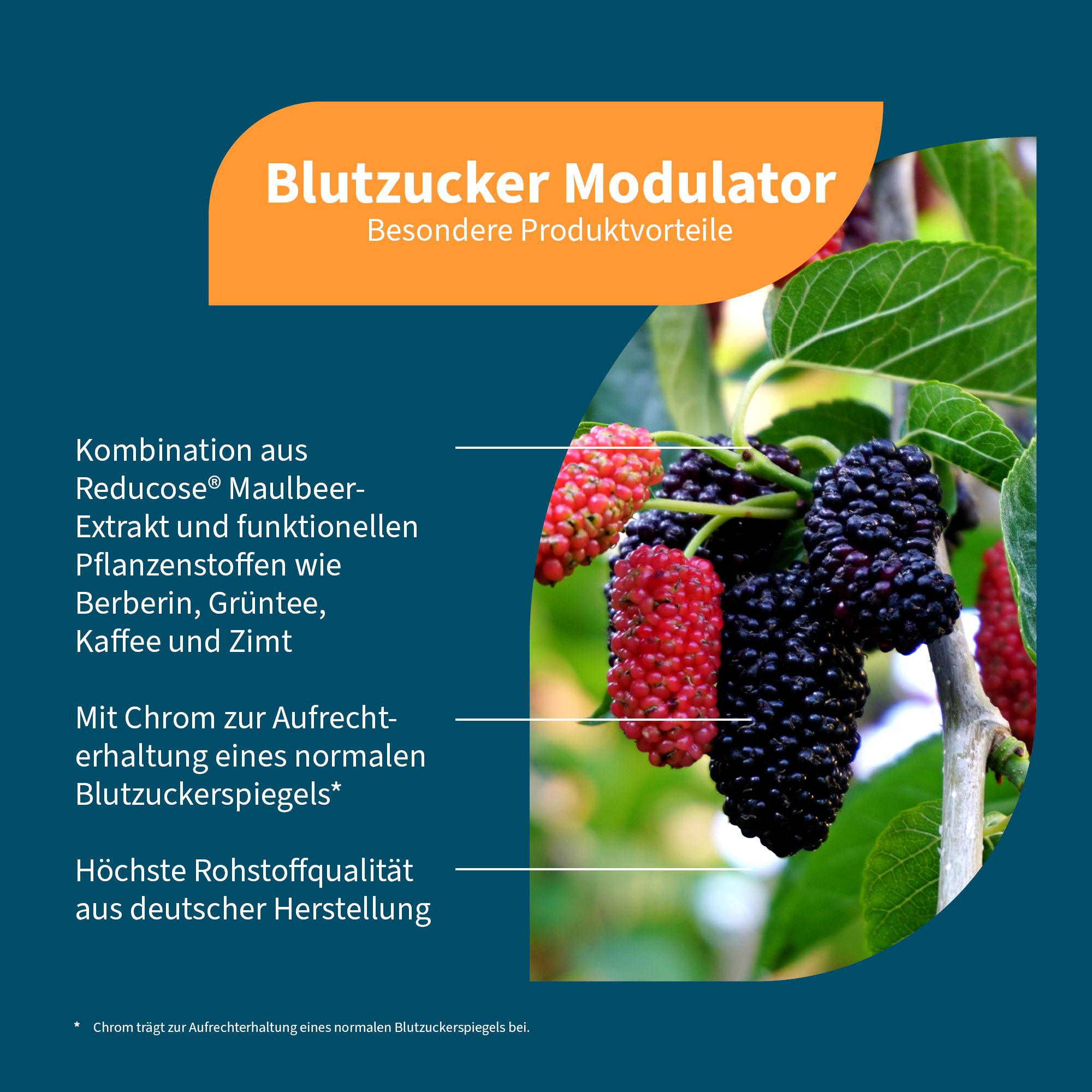 NatuGena BlutzuckerModulator – Kombiniert hochwertige Pflanzenextrakte mit essenziellen Mikronährstoffen. Die Rezeptur vereint Reducose® aus Maulbeer-Extrakt, Berberin und Chrom mit weiteren pflanzlichen Komponenten wie Zimt, Grüntee, Akazienfaser (Inavea™) und grünem Kaffeebohnen-Extrakt. 60 Kapseln für eine 30-Tage-Versorgung.