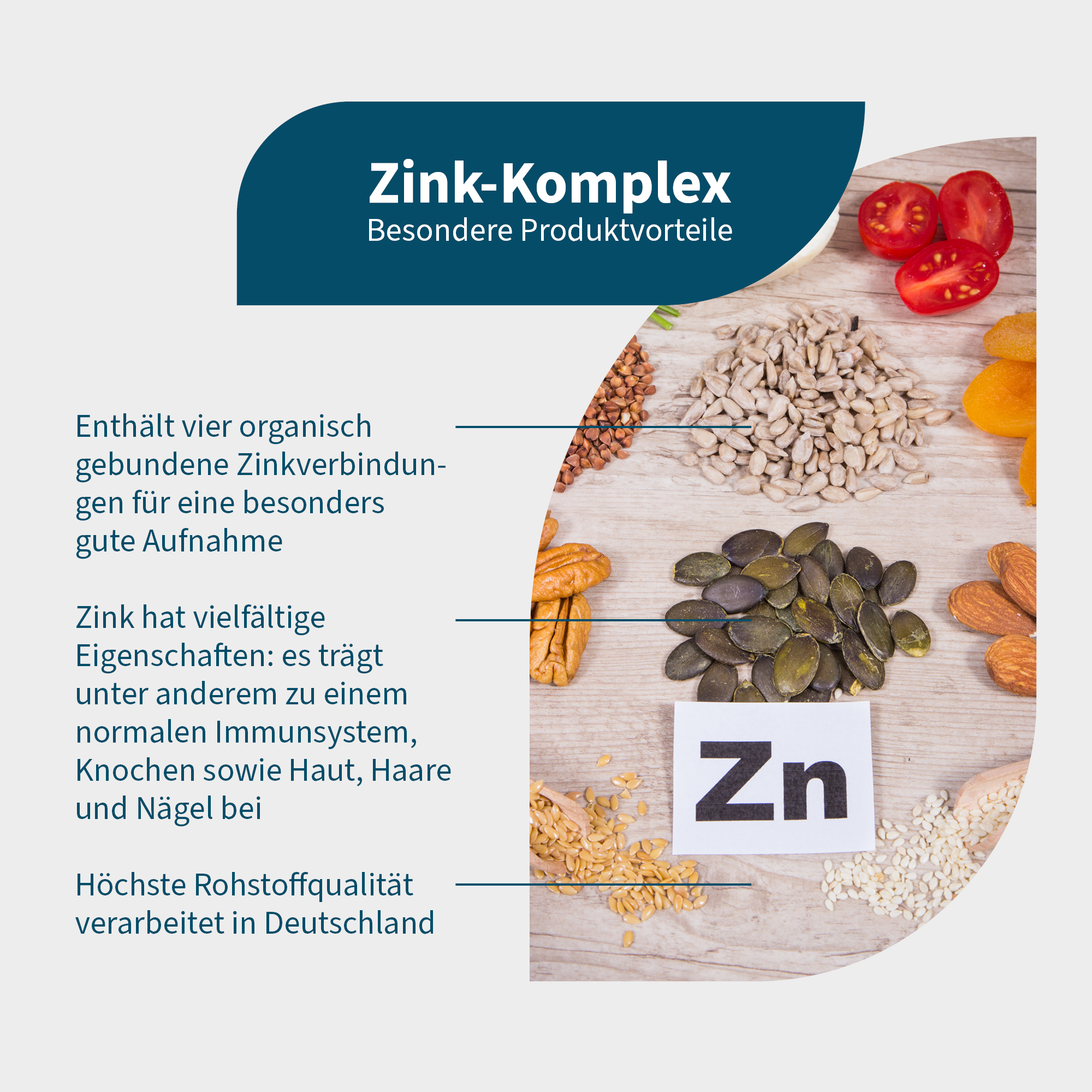 • Zink-Komplex: Zink-Komplex aus Zinkbisglycinat, Zinkcitrat, Zinkgluconat und Zinkpicolinat
