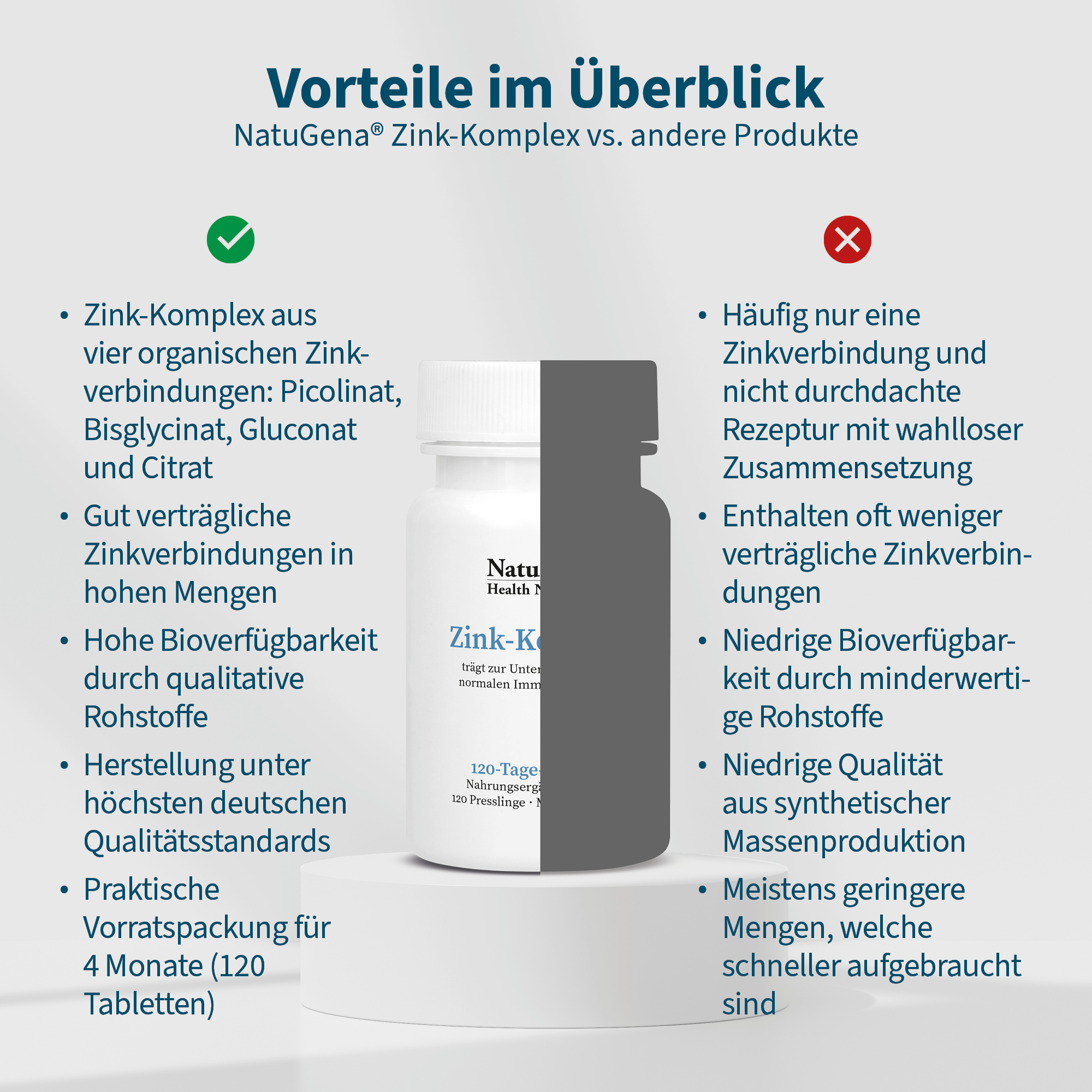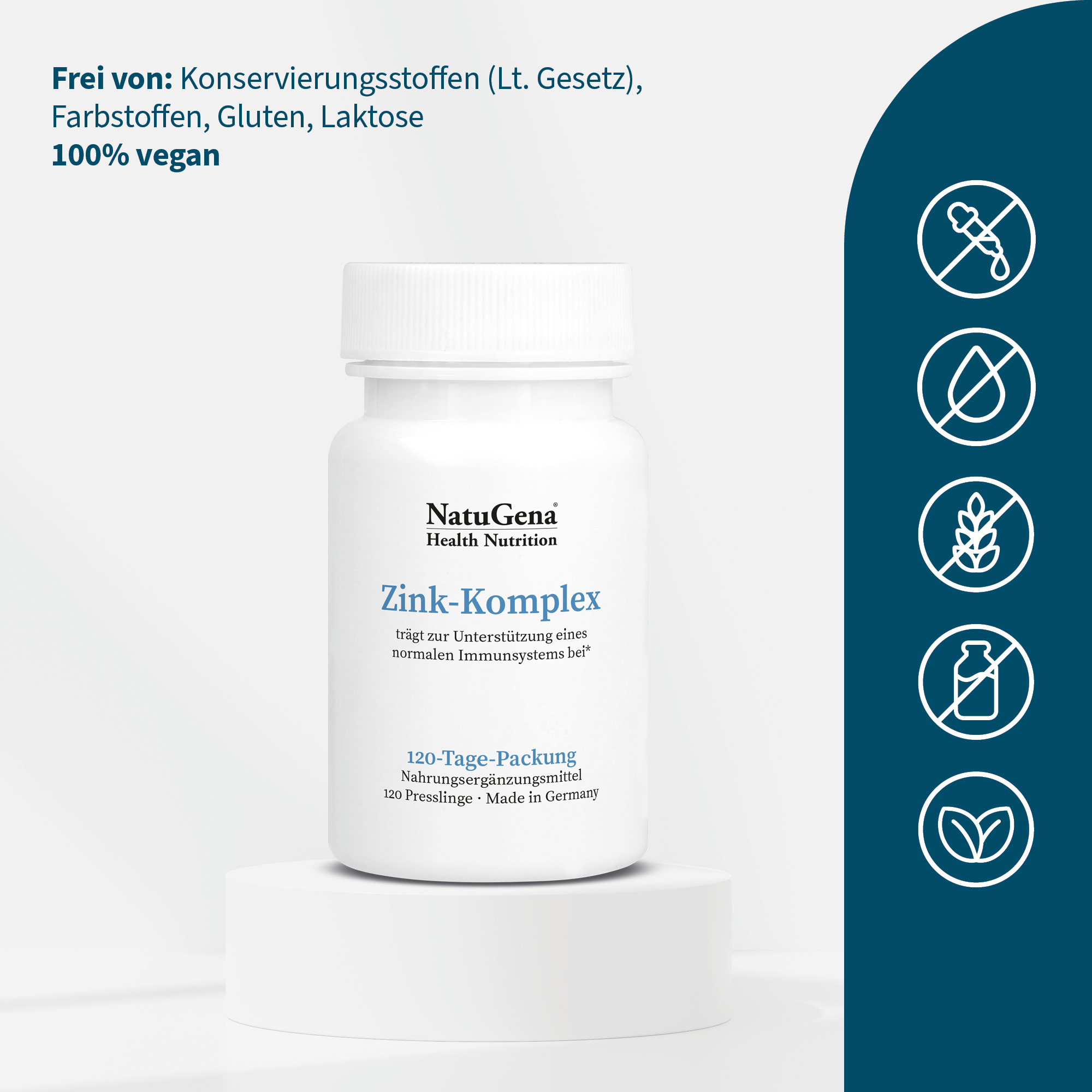 NatuGena Zink Komplex – Hochwertige Kombination aus vier organischen Zinkverbindungen zur optimalen Unterstützung des Immunsystems. Frei von Zusatzstoffen, vegan und hergestellt in Deutschland.120 Presslinge für eine 4 Monats-Versorgung.