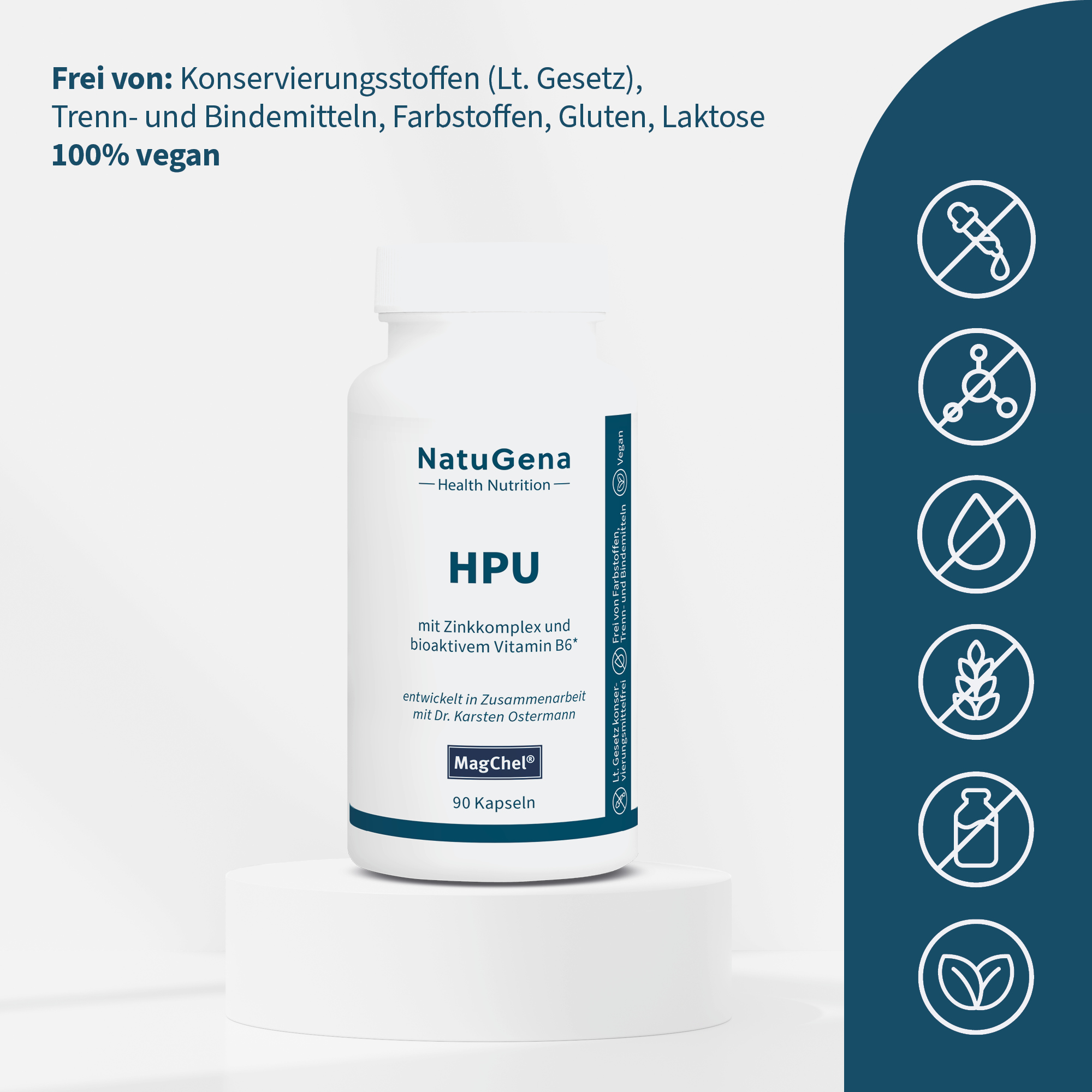 NatuGena HPU – Eine gezielt entwickelte Mikronährstoffkombination, die essenzielle Vitamine, Spurenelemente und funktionelle Nährstoffe vereint. Enthalten sind unter anderem die B-Vitamine B2, B3, B6, B7, B9 und B12 in ihrer bioaktiven Form sowie Mineralstoffe wie Zink, Magnesium, Selen und Mangan. Zusätzlich erweitert durch die Inhaltsstoffe L-Cystein, Cholin, Myo-Inositol und Vitamin C aus Camu-Camu. Entwickelt in Zusammenarbeit mit Dr. med. Karsten Ostermann zur Unterstützung des Stoffwechsels. 90 Kapseln für eine 30-Tage-Versorgung.