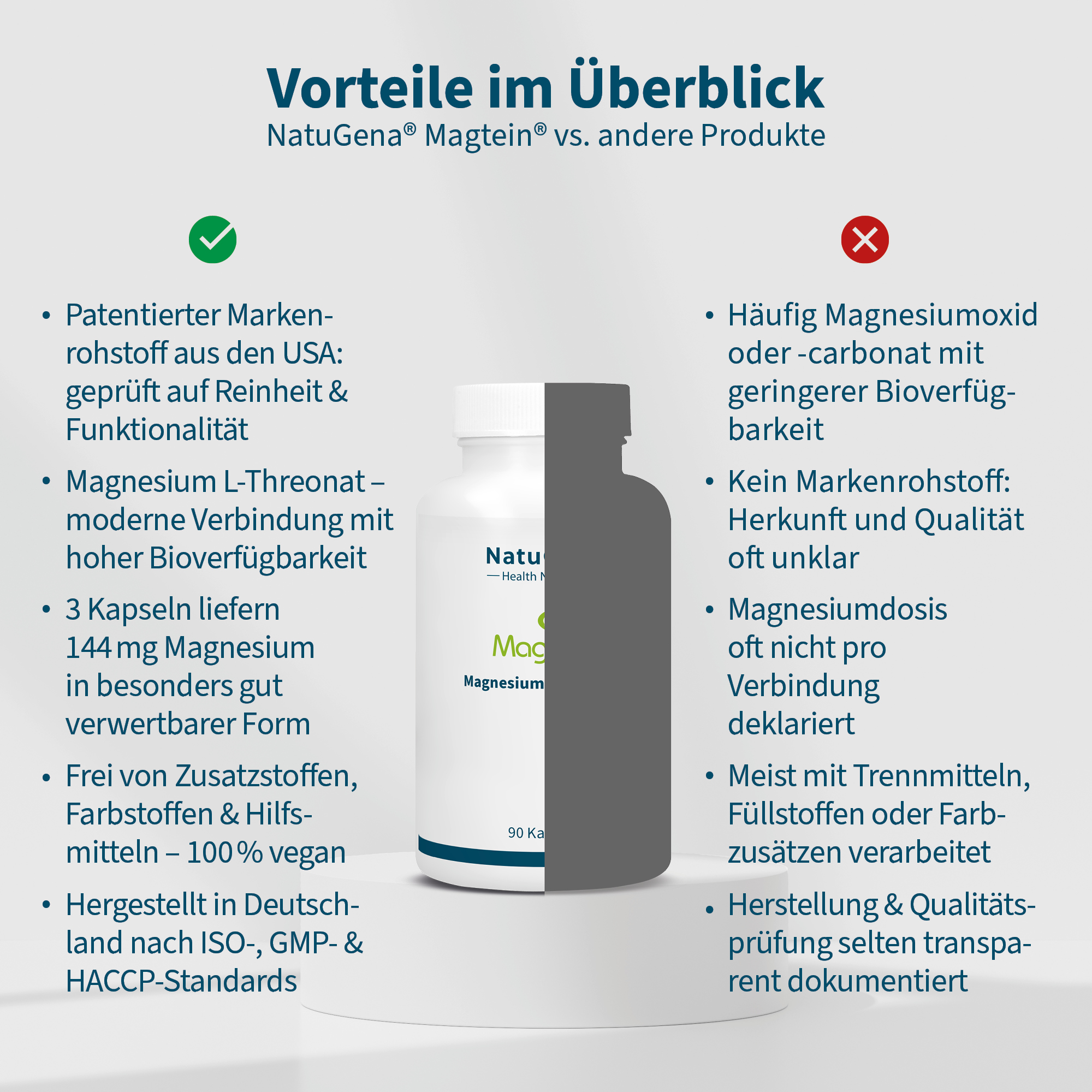 Magtein® von NatuGenaPatentierter Markenrohstoff Magtein® aus geprüfter Herstellung in den USA. Enthält Magnesium, gebunden an L-Threonsäure, ein natürliches Stoffwechselprodukt von Vitamin C. Diese Form zeichnet sich durch eine besonders hohe Bioverfügbarkeit aus. Enthält 2003 mg Magnesium L-Threonat pro Tagesdosis (entspricht 144 mg elementarem Magnesium). 90 Kapseln für eine 30-Tage-Versorgung.