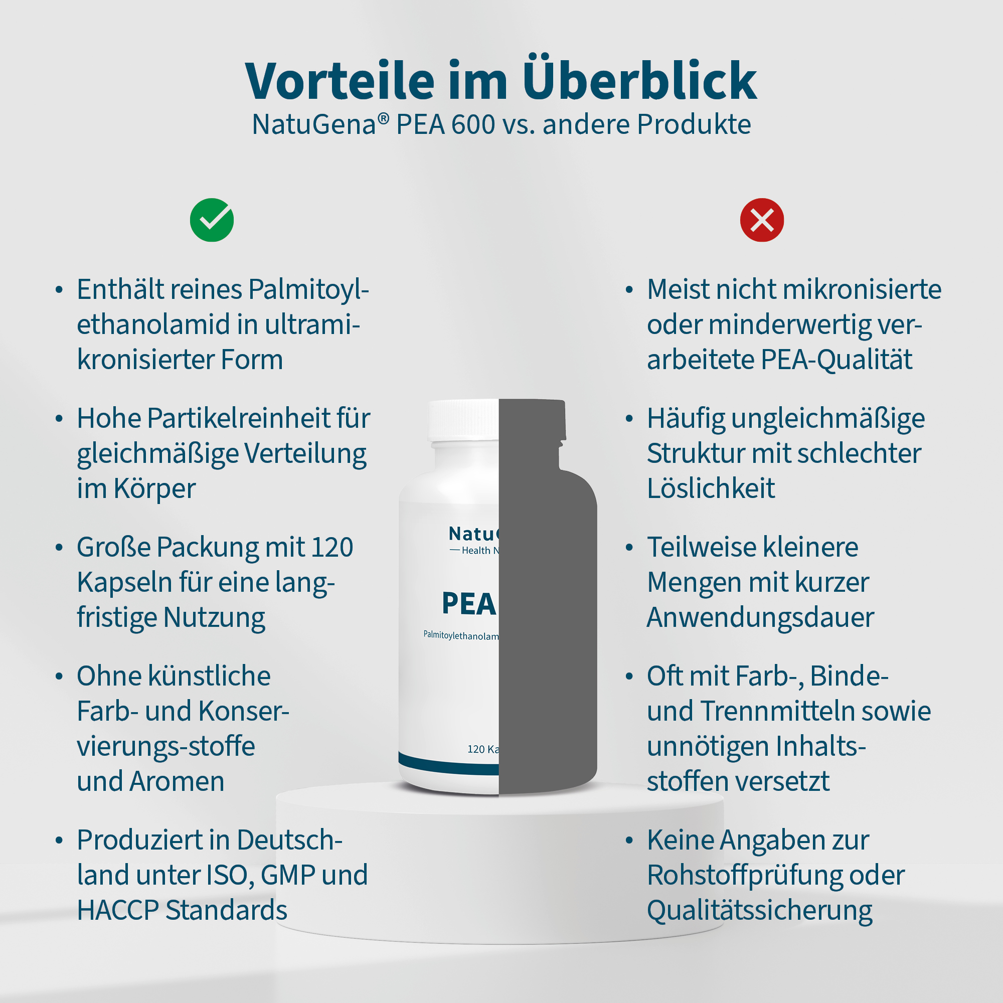 NatuGena PEA 600 – Liefert 600 mg reines PEA (Palmitoylethanolamid) pro Kapsel. PEA ist ein körpereigener Fettsäurebaustein aus der Gruppe der N-Acylethanolamide, das von Natur aus im menschlichen Körper, Tieren und Pflanzen vorkommt. 120 vegane Kapseln für eine 4-Monats-Versorgung.