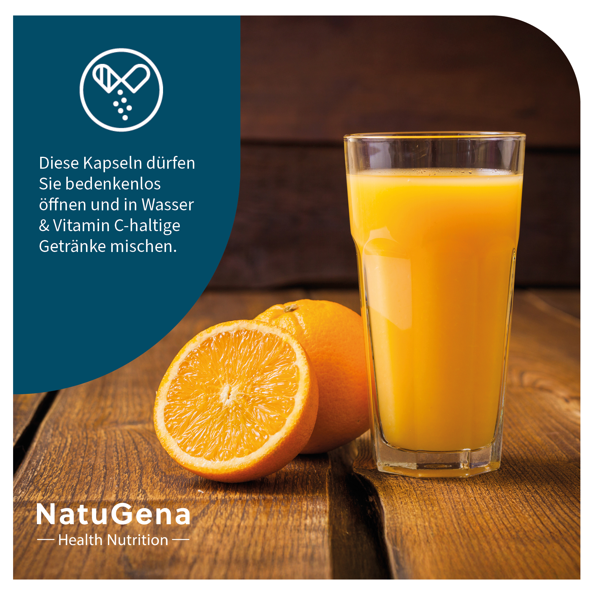NatuGena Lactoferrin – Hochwertiges Bioferrin® 2000 aus frischer Süßmolke ergänzt mit Eisen, Kupfer, Vitamin C und B-Vitaminen. Entwickelt in Zusammenarbeit mit Prof. Dr. rer. nat. Brigitte König. 30 vegetarische Kapseln für eine 30-Tage-Versorgung.