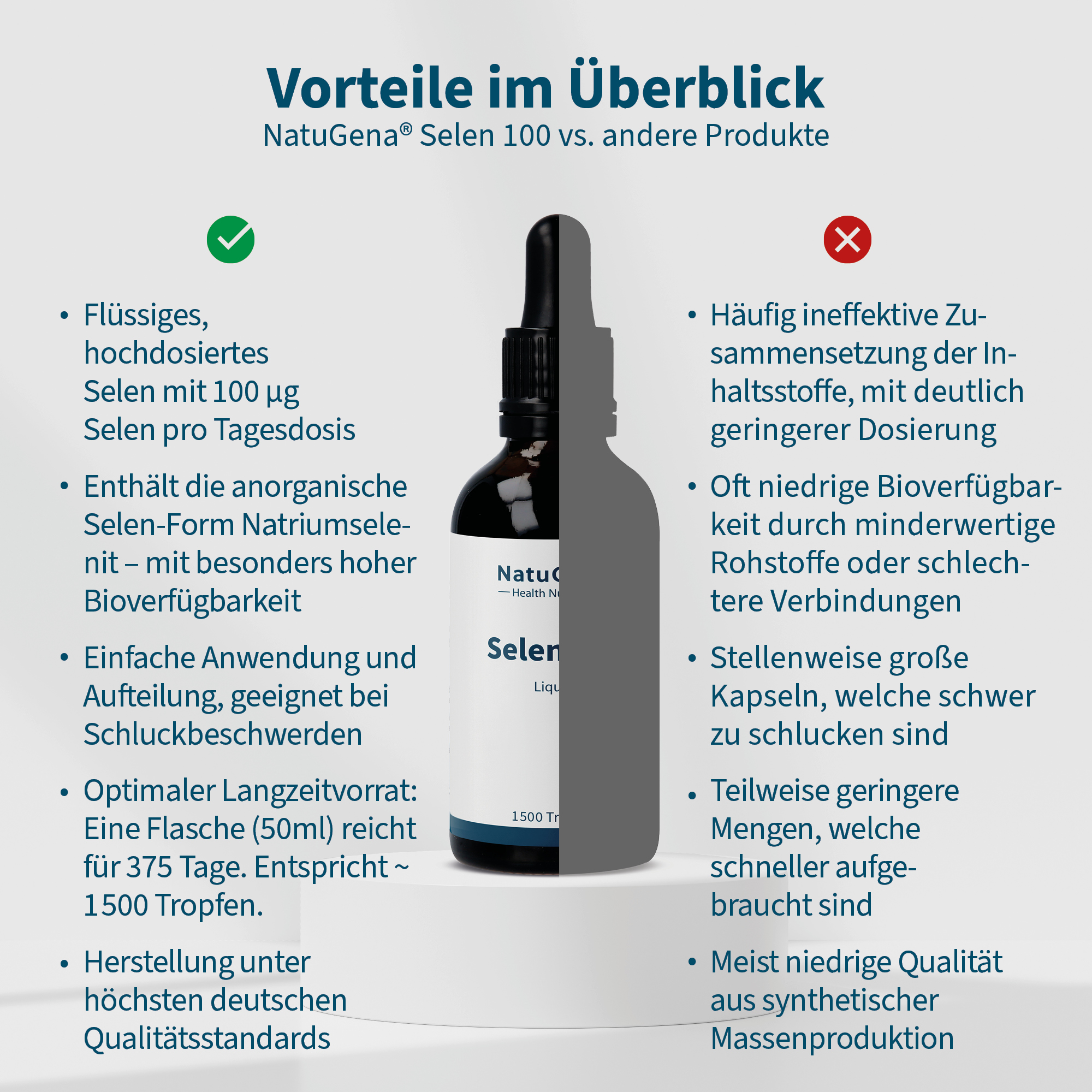 Selen 100 basiert auf der anorganischen Selen-Form Natriumselenit. Dieser hochwertige Rohstoff charakterisiert sich durch eine besonders hohe Bioverfügbarkeit und exzellente Stabilität. Die 50 ml lassen sich durch die zugehörige Pipette auf 1500 Tropfen aufteilen und ermöglichen eine exakte Tagesdosierung von vier Tropfen mit einem langlebigen Produktlebenszyklus von 375 Tagen.