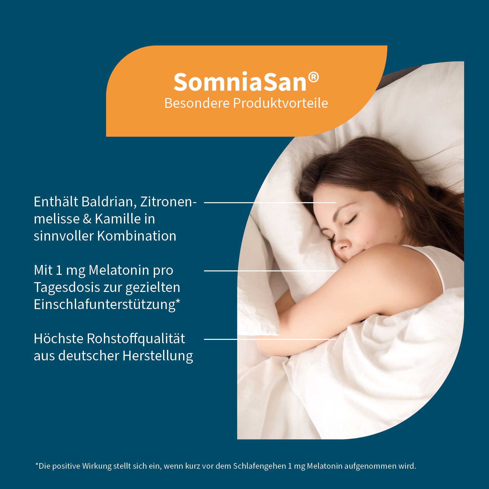 L-Theanin ist eine besondere Aminosäure aus den Blättern des grünen Tees. Sie ist für ihre enge Verbindung zur Teepflanze bekannt und rundet die pflanzliche Zusammensetzung von SomniaSan® ab. Melatonin dagegen ist ein körpereigenes Hormon, das den Tag-Nacht-Rhythmus unterstützt. Eine tägliche Einnahme von 1 mg Melatonin vor dem Schlafengehen kann helfen, die Einschlafzeit zu verkürzen*. Besonders auf Reisen ist es auch hilfreich, um Jetlag-Empfindungen auszugleichen**.