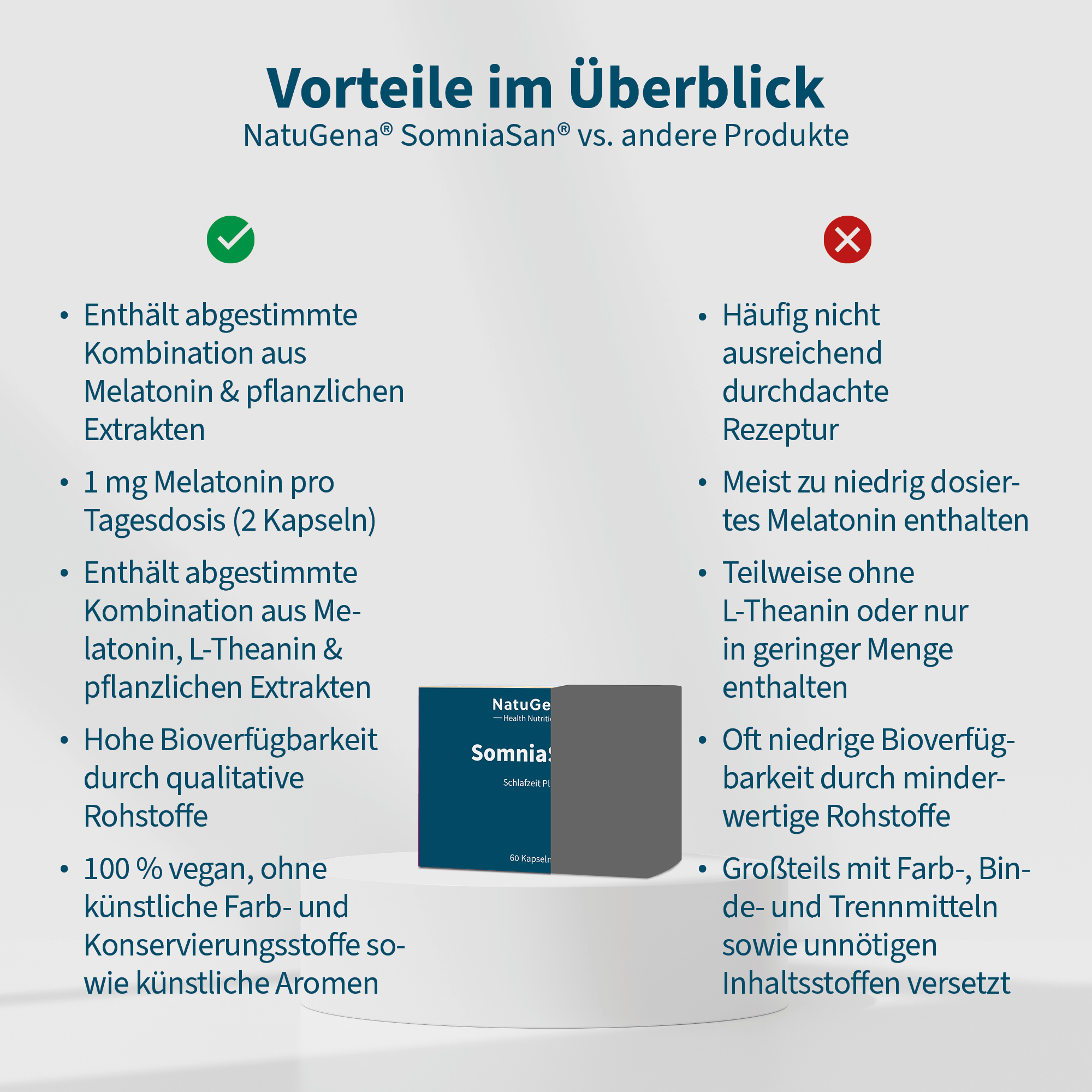 NatuGena SomniaSan® – enthält eine durchdachte Kombination aus bewährten Pflanzenextrakten, hochwertigem L-Theanin aus grünem Tee und Melatonin. Zitronenmelisse, Kamille und Baldrian sind traditionelle Begleiter für den Abend – ergänzt durch 1 mg Melatonin pro Tagesdosis und 200 mg L-Theanin. 60 vegane Kapseln für eine 30-Tage-Versorgung.