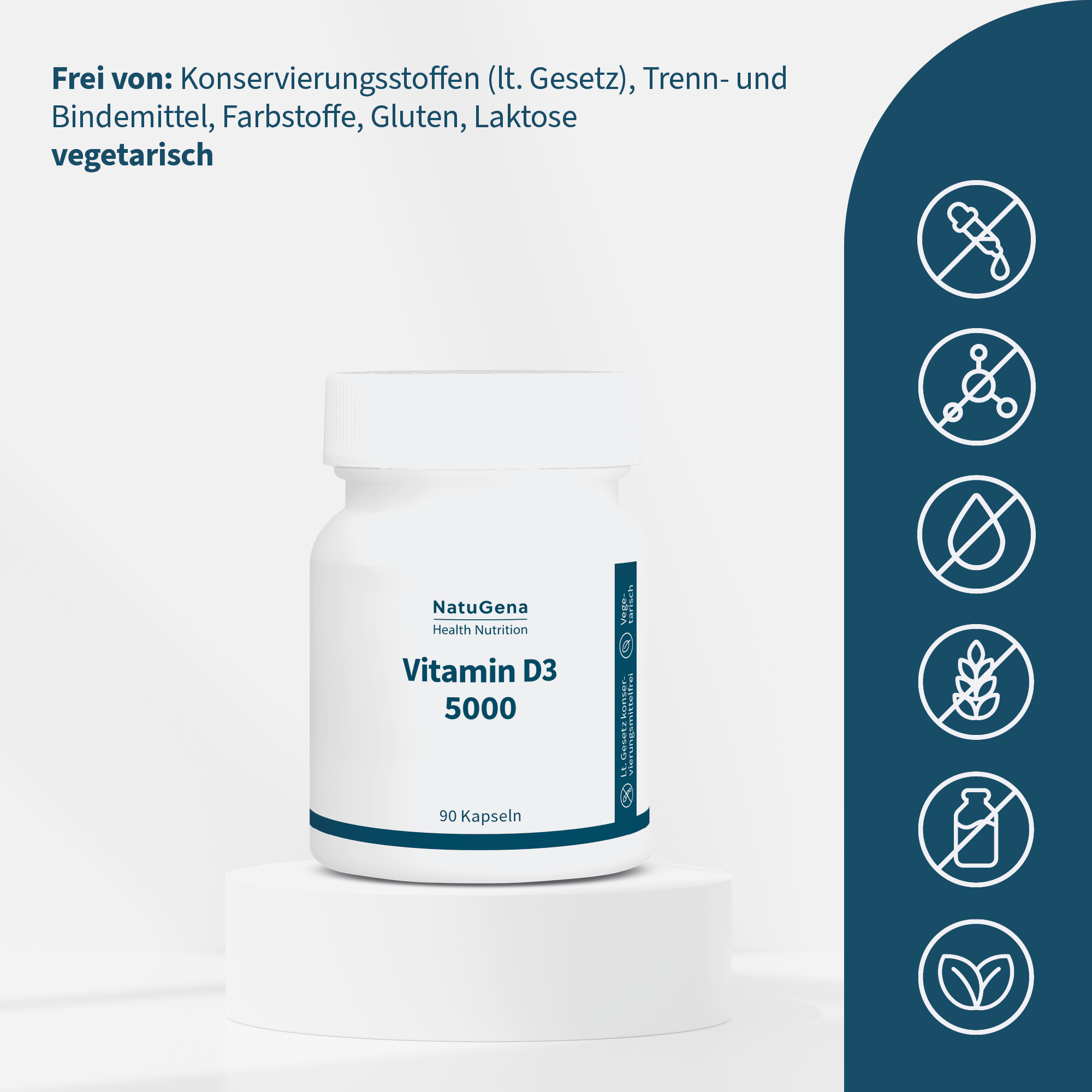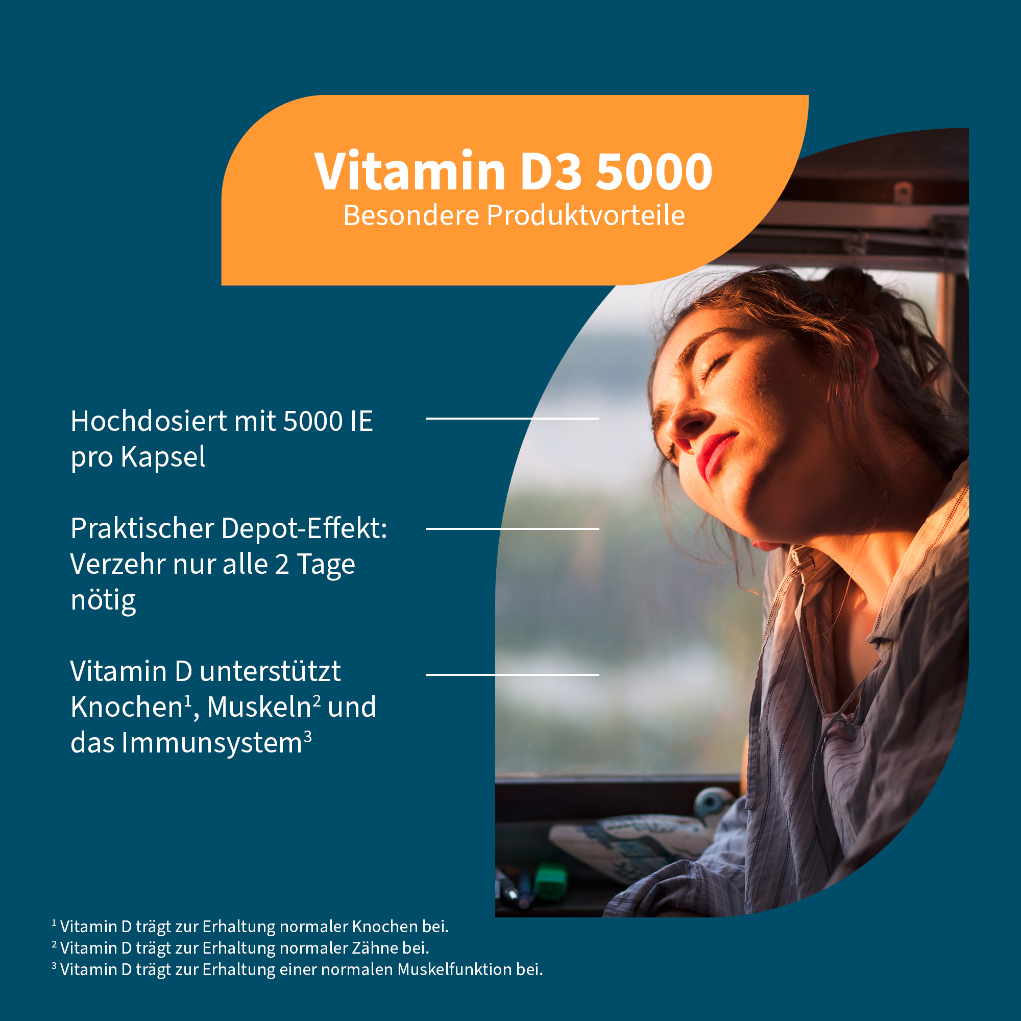 Vitamin D3 5000 Kapseln – Hochdosiertes Vitamin D3 mit 125 µg pro Kapsel. 90 vegetarische Kapseln für eine Versorgung von bis zu 180 Tagen bei Einnahme von einer Kapsel alle zwei Tage.
