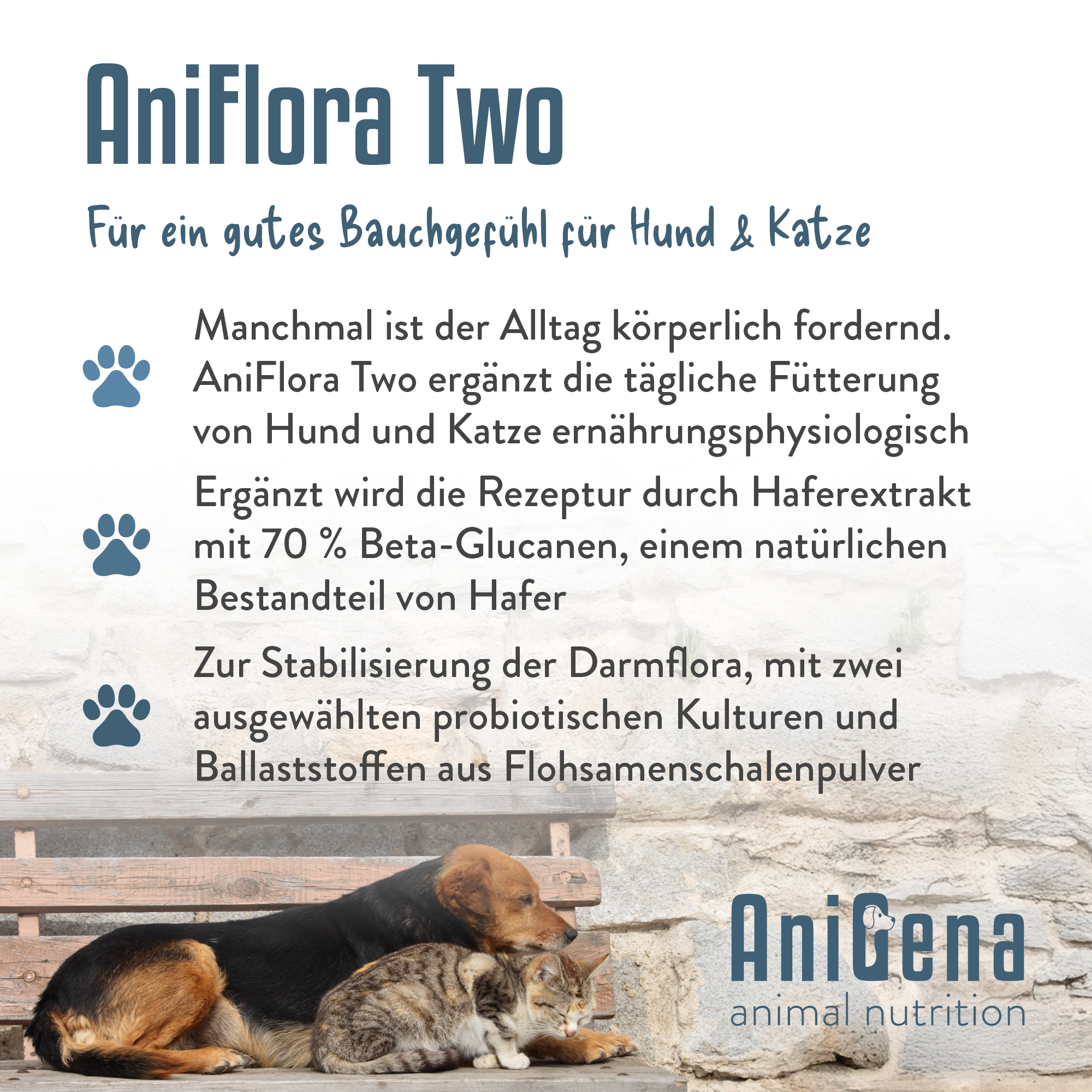 AniFlora Two ist ein fein vermahlenes Ergänzungsfuttermittel für Hunde und Katzen, das zur ernährungsphysiologischen Unterstützung der Darmflora mit unserer Tierärztin entwickelt wurde. Die durchdachte Rezeptur kombiniert ausgewählte präbiotische Ballaststoffquellen mit probiotischen Kulturen und ist auf eine gute Verträglichkeit ausgelegt. Die enthaltenen Ballaststoffe aus Akazienfaser, Flohsamenschalenpulver und Haferextrakt ergänzen die tägliche Fütterung insbesondere in Phasen veränderter Routinen, wie etwa bei Futterumstellungen oder besonderen Alltagssituationen. Das feine Pulver lässt sich einfach unter das Futter mischen oder mit etwas Flüssigkeit anrühren.