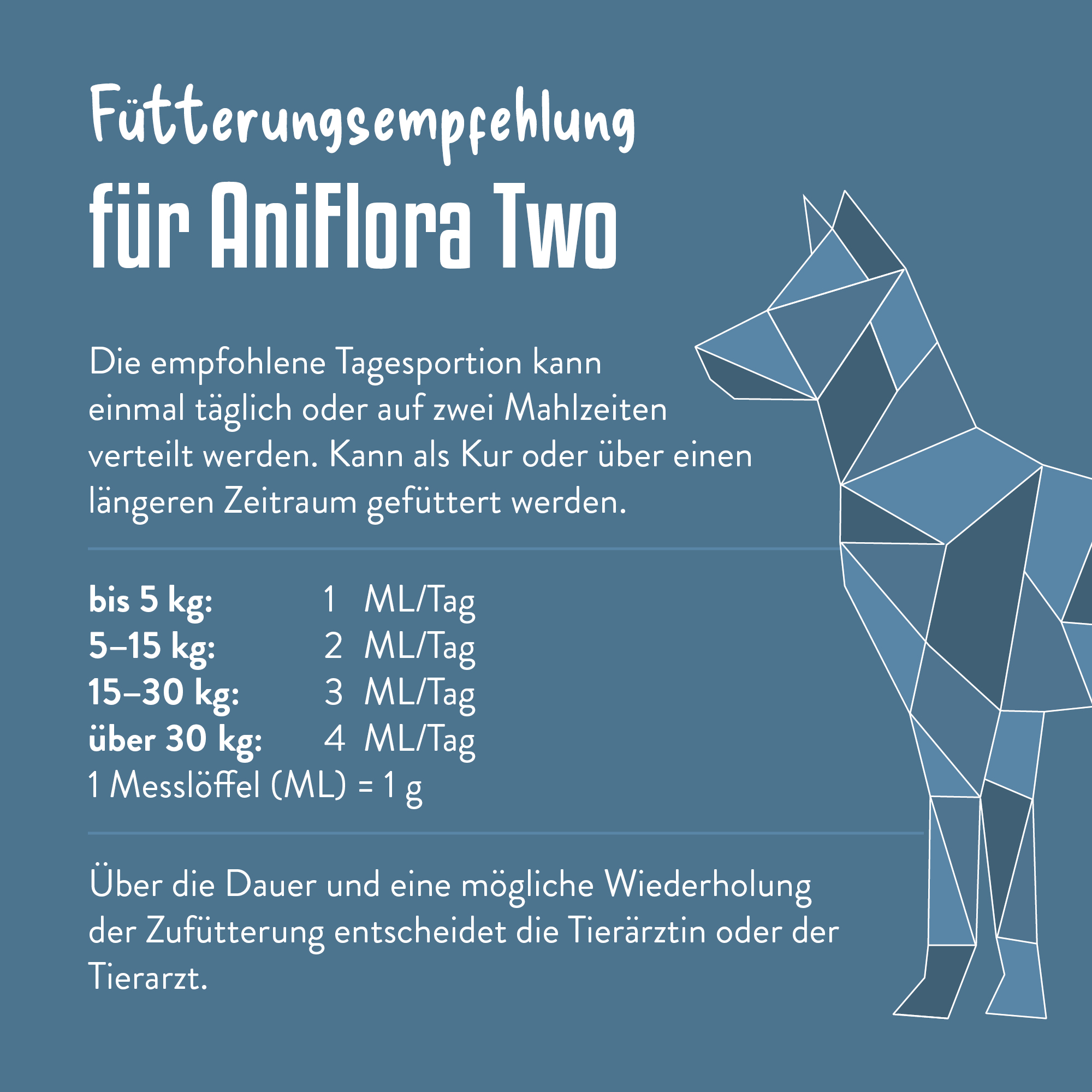 AniFlora Two kann als zeitlich begrenzte Kur oder zur regelmäßigen Ergänzung der täglichen Fütterung eingesetzt werden. Über eine Wiederholung der Zufütterung entscheidet die Tierärztin oder der Tierarzt.
