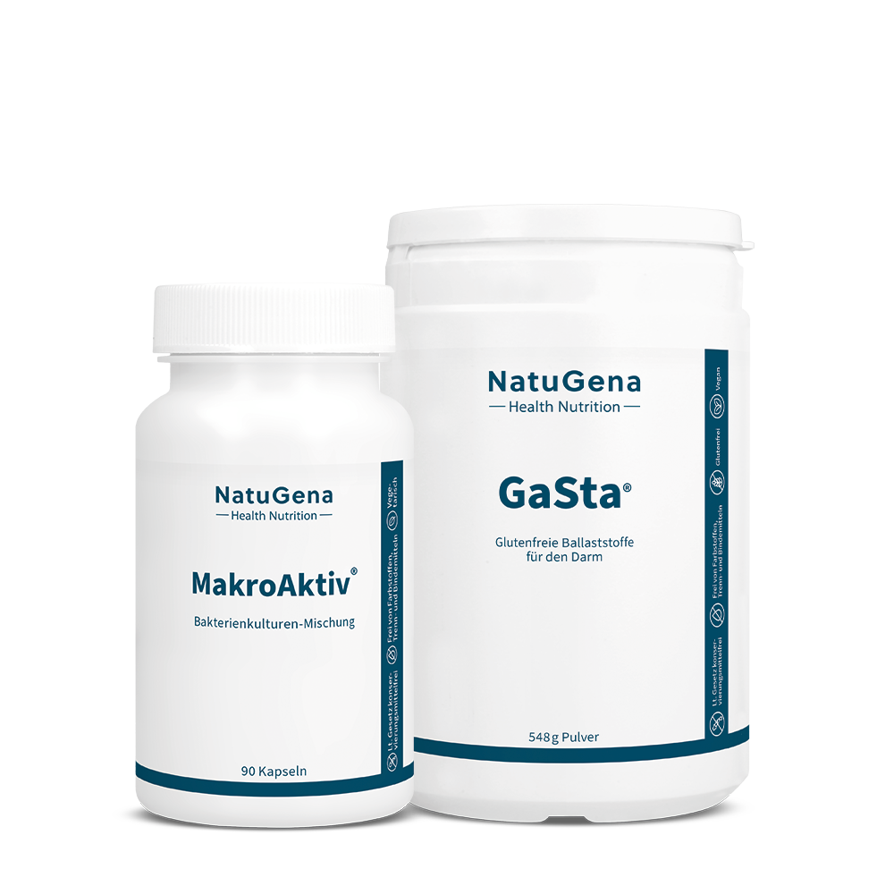 GaSta-Komplex ist ein Vorteilsset zur Unterstützung der sanften Darmsanierung mit hochwertigen wasserlöslichen und wasserunlöslichen, glutenfreien Ballaststoffen. Es enthält außerdem eine Mischung lebender Bakterienkulturen, Colostrum, Ölsäure, Chondroitinsulfat, Vitamin D3, Vitamin A und K2 (MK-7).