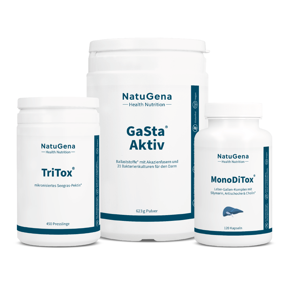 • In der Kombination mit GastaAktiv/BallstoffPur, wird in der Regel MonoDiTox am Abend und TriTox zum zu Bettgehen und GaSta/BallaststoffPur am Morgen empfohlen. MonoDiTox und GastaAkiv am Morgen und Tritox am Abend, ist auch möglich. Bitte sprechen Sie die individuelle Einnahme nach Verträglichkeit mit weiteren Mitteln und Routinen im Alltag mit Ihrem Therapeuten ab.
