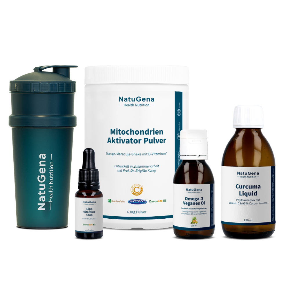 • Vorteilsset bestehend aus 1x Shaker, 1x Curcuma liquid, 1x MitochondrienAktivator Pulver, 1x Omega 3 Öl vegan, 1x LipoVitamine 1000