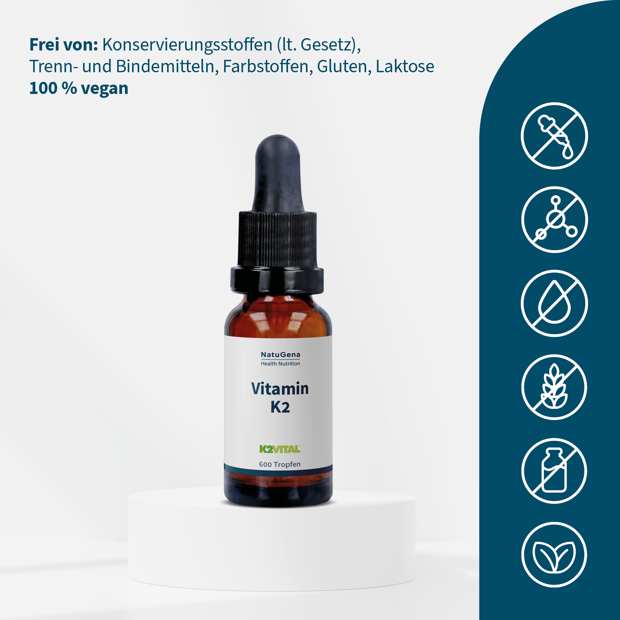Vitamin K2 von NatuGena – 200 µg Vitamin K2 in Tropfenform in Form des hochwertigen Markenrohstoffs K2Vital®. Mit MCT-Kokosnussöl als Trägerstoff für eine bessere Bioverfügbarkeit. 20 ml mit rund 600 Tropfen für eine 75-Tage-Versorgung.