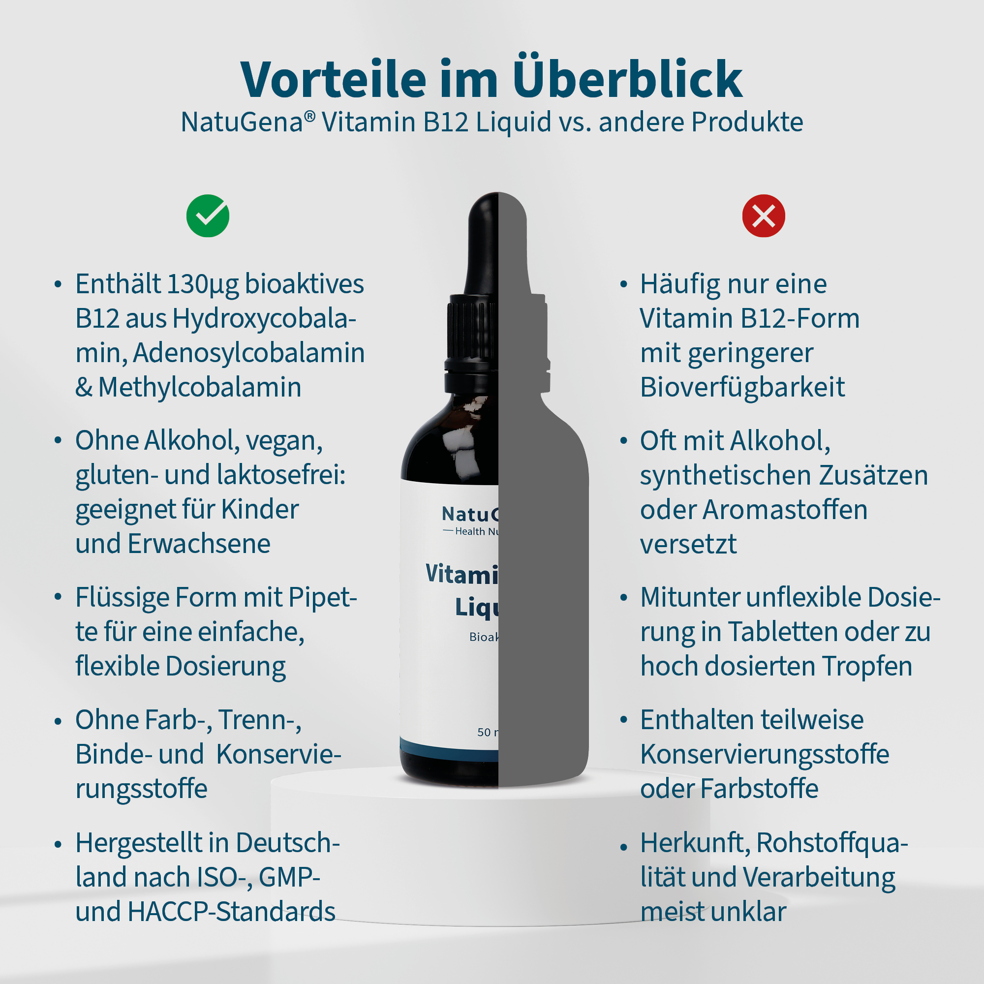 Vitamin B12 Liquid von NatuGena – Flüssiges Vitamin B12 mit drei bioaktiven Verbindungen: Methylcobalamin, Adenosylcobalamin und Hydroxycobalamin. 130 µg Vitamin B12 pro Tagesdosis. 50 ml mit 850 Tropfen für eine 65-Tage-Versorgung.