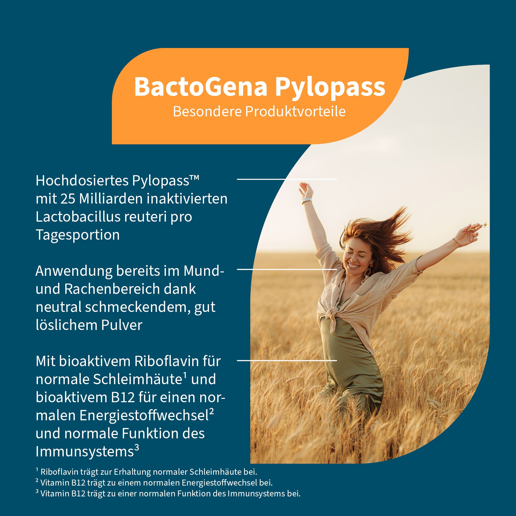 BactoGena Pylopass wurde speziell für diesen Bereich konzipiert. Die Pulverform ermöglicht eine Anwendung bereits im Mund- und Rachenraum, bevor die Inhaltsstoffe weiter in den Magen gelangen. Die Kombination aus inaktiviertem Lactobacillus reuteri DSM17648, Bio-Akazienfaser und ausgewählten B-Vitaminen ist auf diesen Anwendungsbereich ausgerichtet.