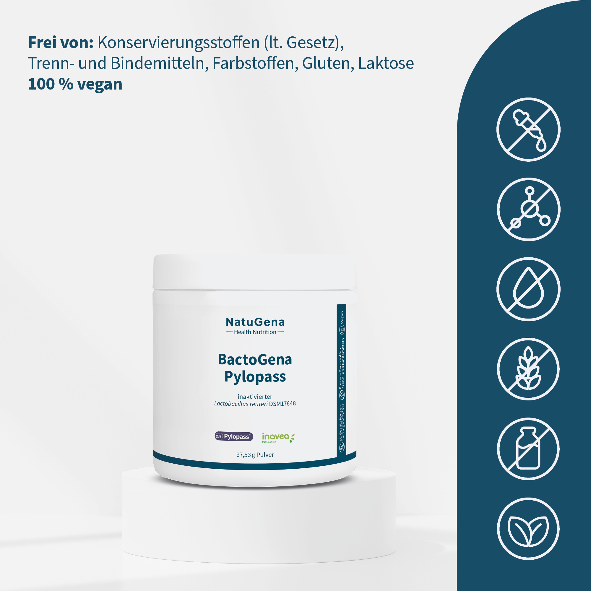 BactoGena Pylopass von NatuGena – Mit inaktiviertem Lactobacillus reuteri DSM17648, Bio-Akazienfaser und bioaktiven B-Vitaminen. Erhältlich als neutral schmeckendes, gut lösliches Pulver. 97,53 g veganes Pulver für eine 30-Tage-Versorgung.