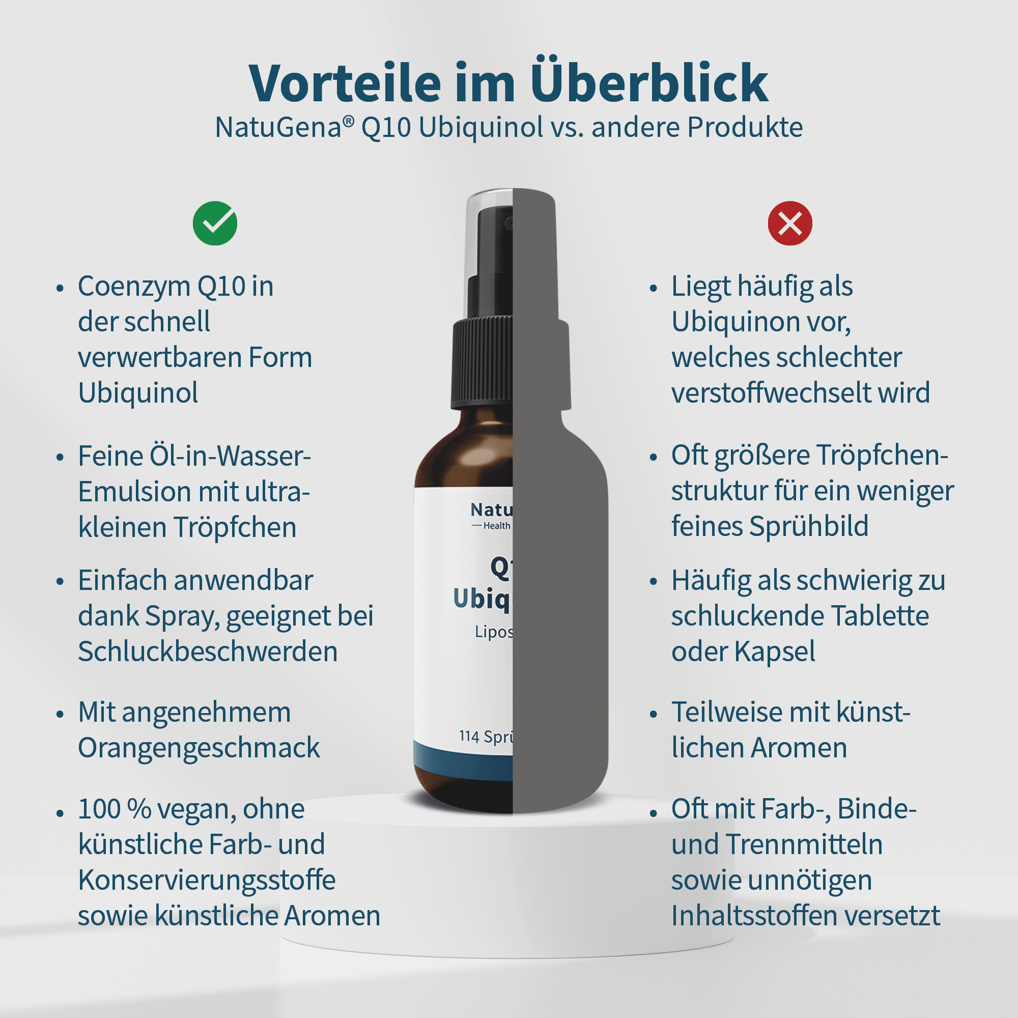 NatuGena Q10 Ubiquinol – Hochdosiertes Ubichinol in liposomaler Formulierung. Einfache Dosierung dank praktischem Sprühkopf mit leckerem natürlichem Orangenöl. 20 ml enthalten ca. 144 Sprühstöße, ausreichend für 30 Tage.